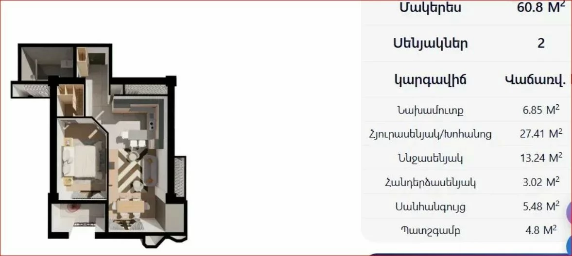 A 2-room apartment is for sale in a newly built residential complex on Nazarbekyan Street. The completion certificate is scheduled for June 2026.