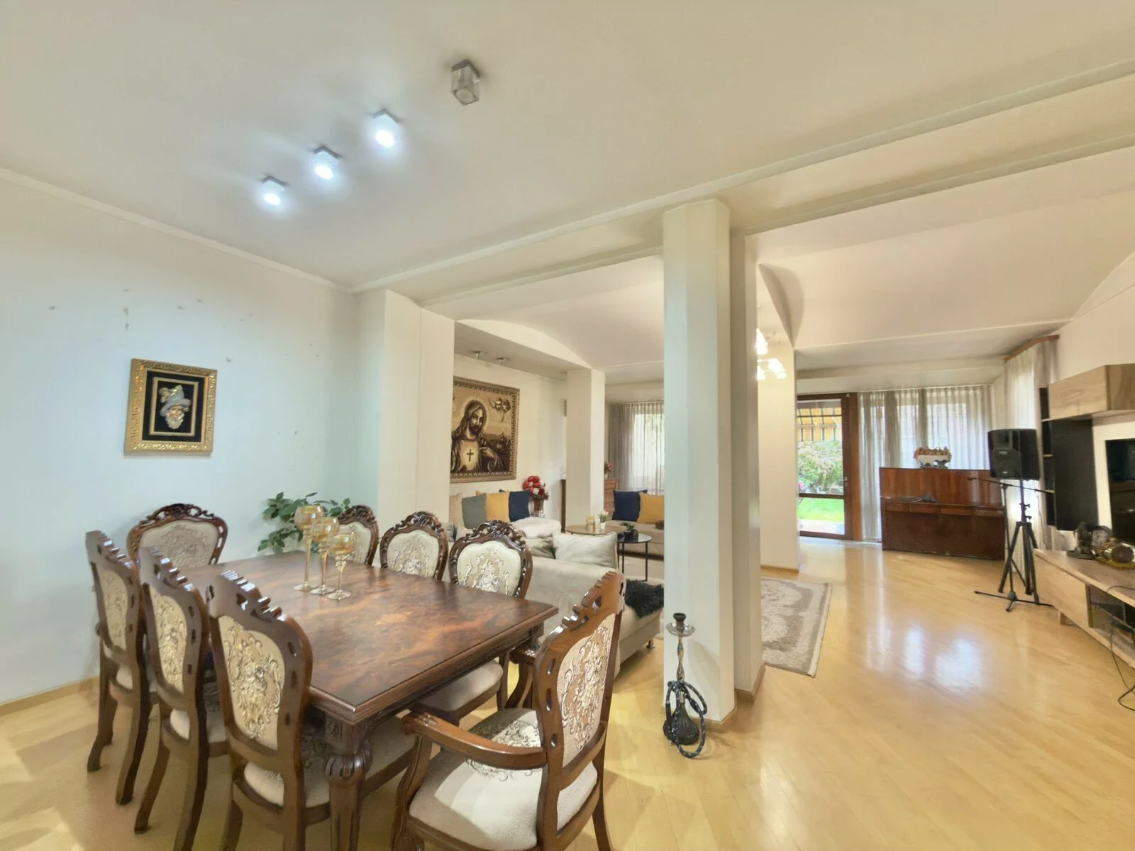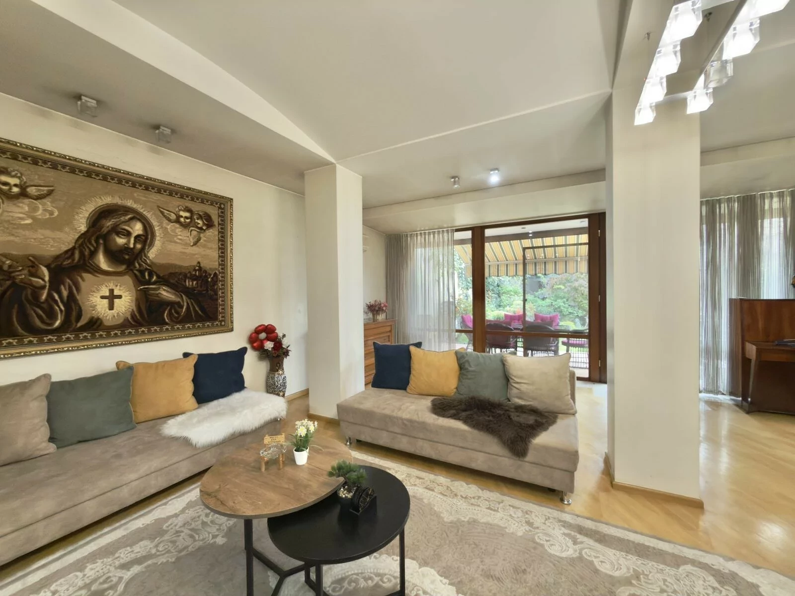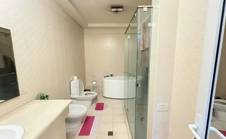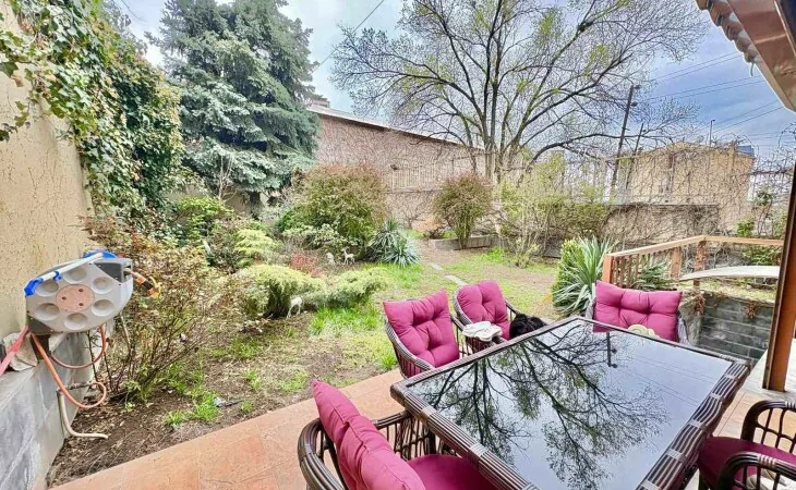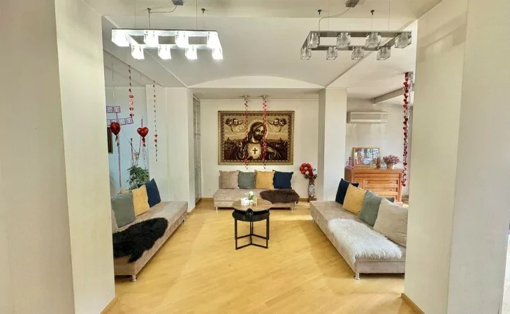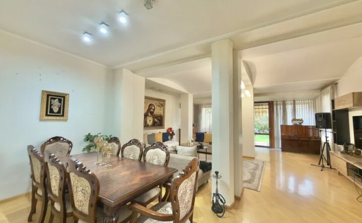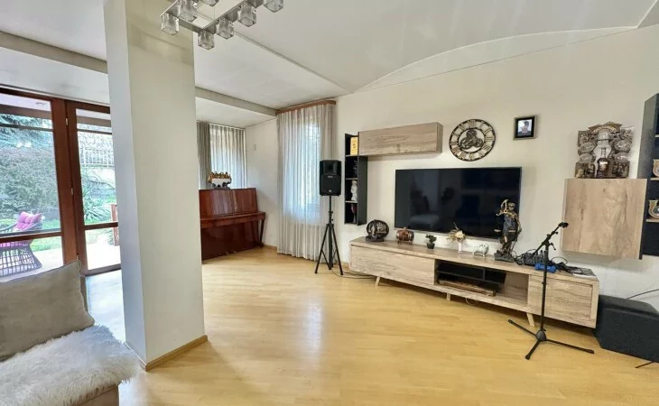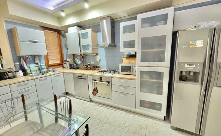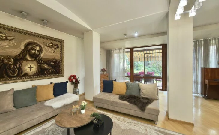 A 5-room apartment with all amenities is for sale. There are 4 bedrooms, 3 bathrooms, a private garden and 2 garages.