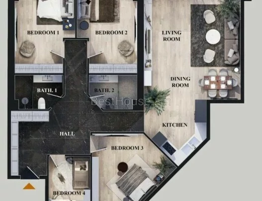 A 4-room apartment with all amenities is for sale in a newly built building, near Malibu Park.