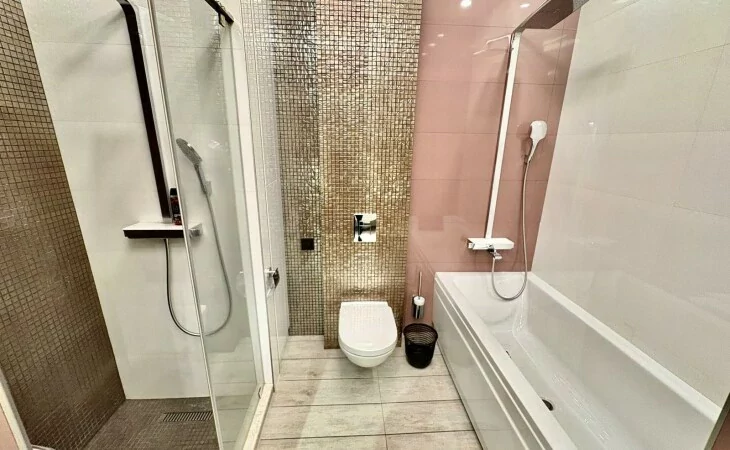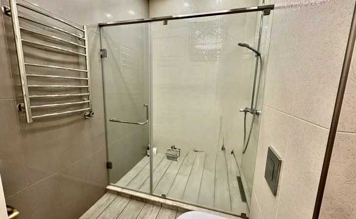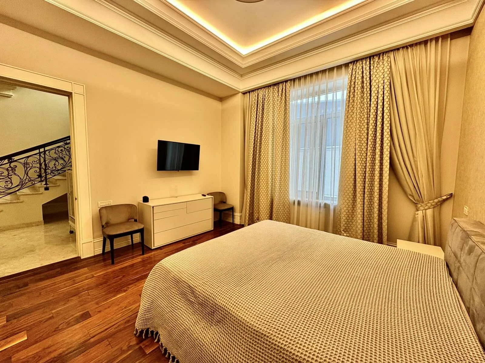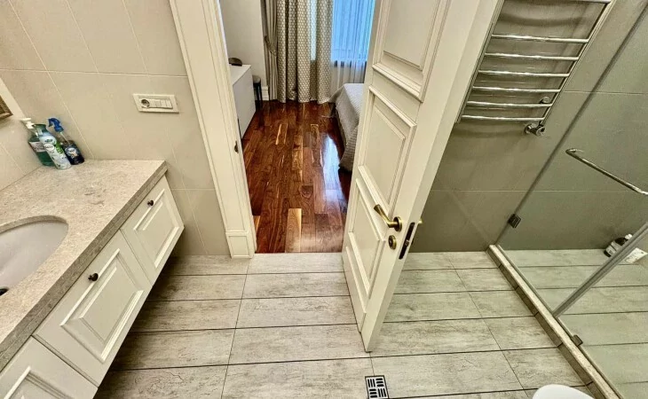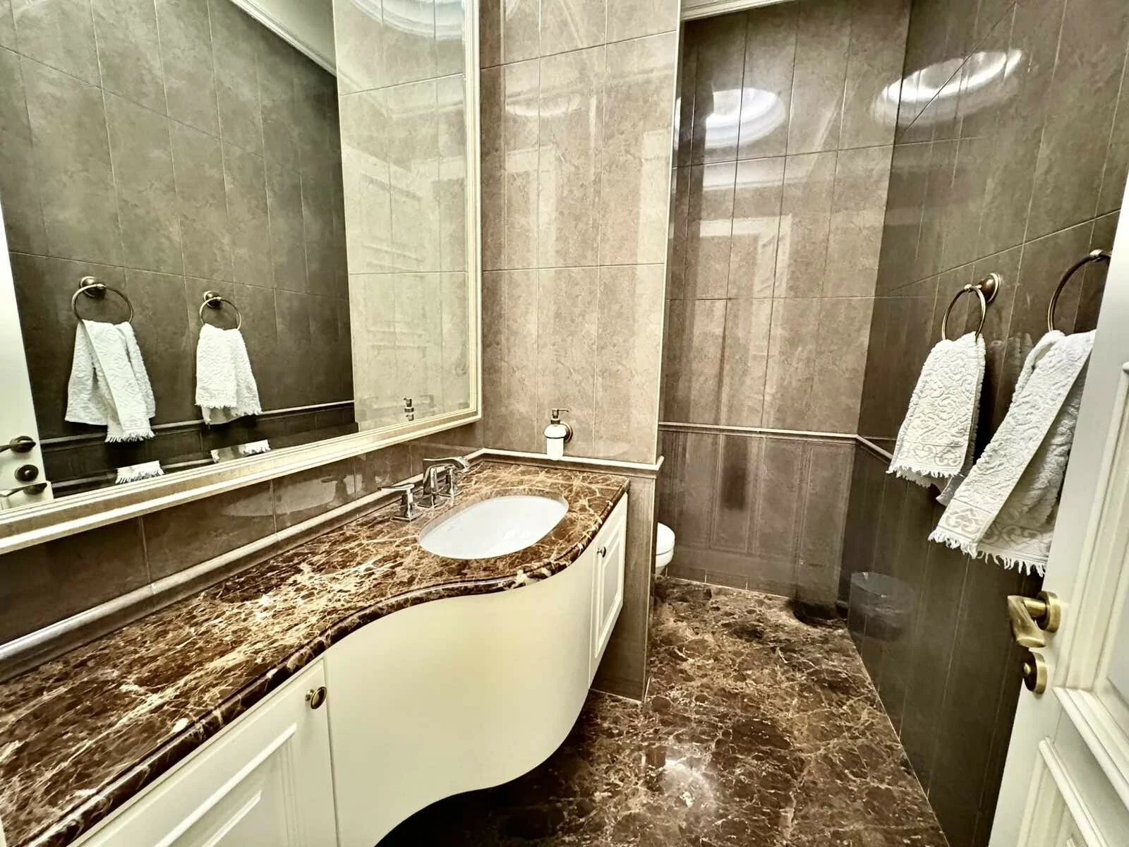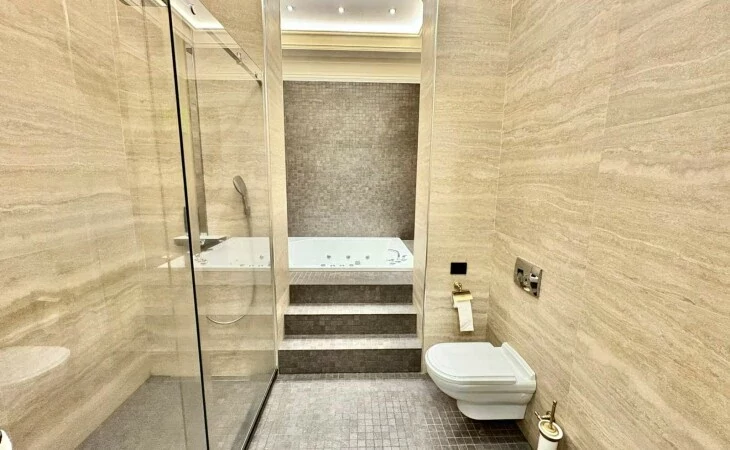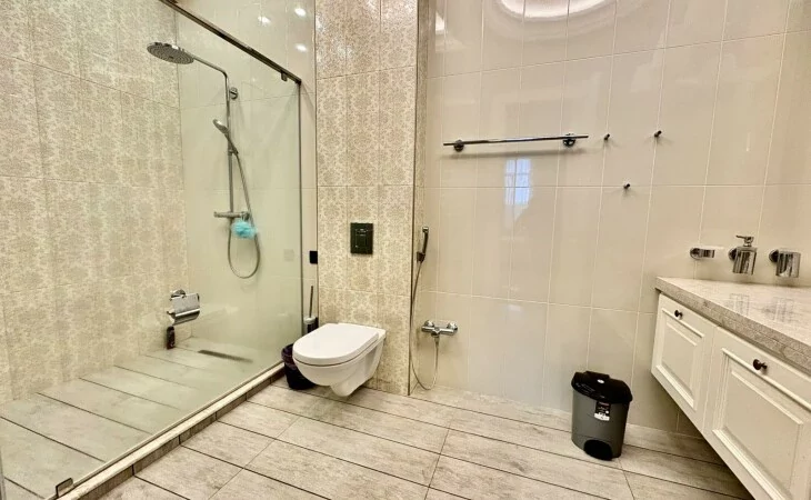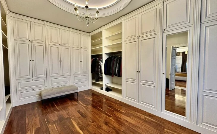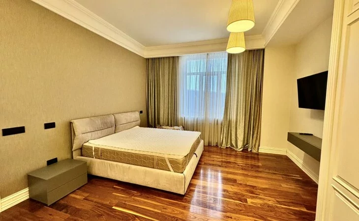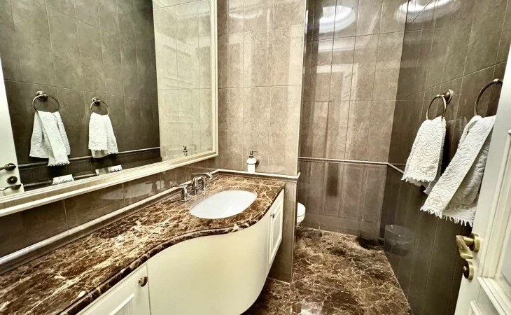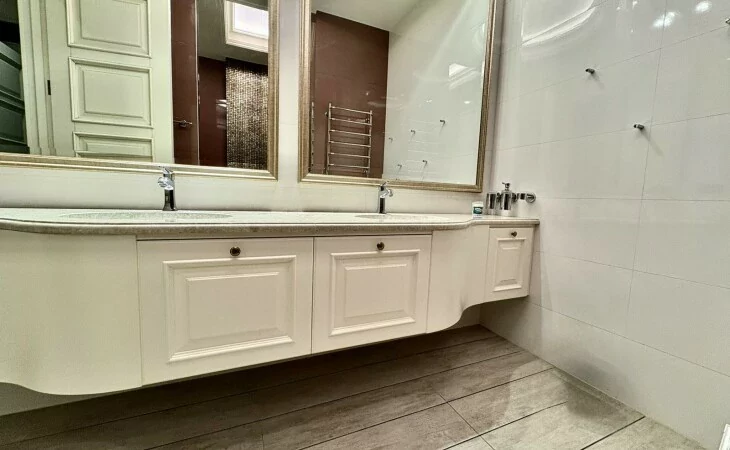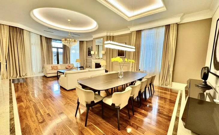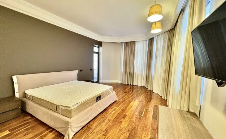 It is a two-story newly built, monolithic house, which consists of 8 rooms, each with a separate bathroom, kitchen, open and closed balconies. The house has a garage, basement, and a swimming pool area.