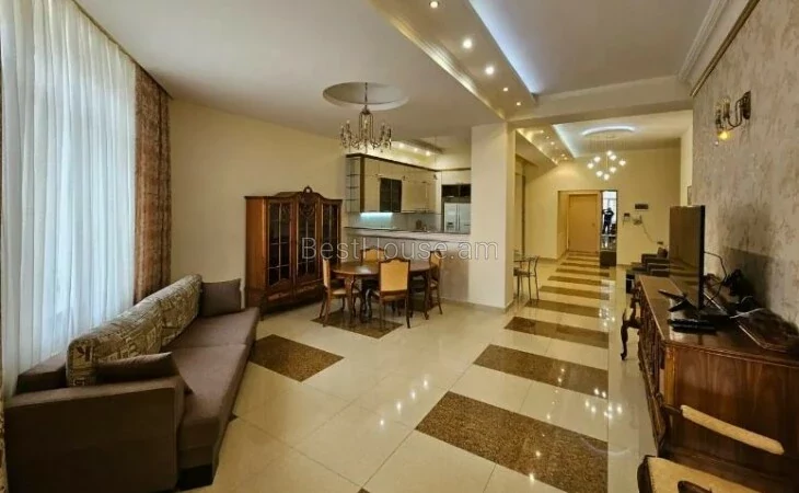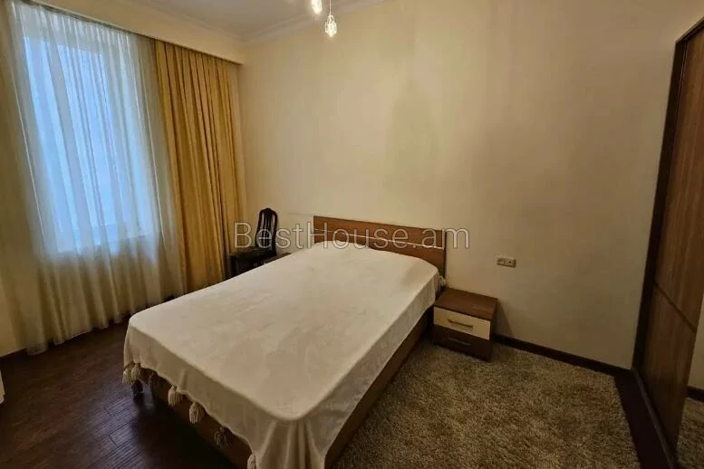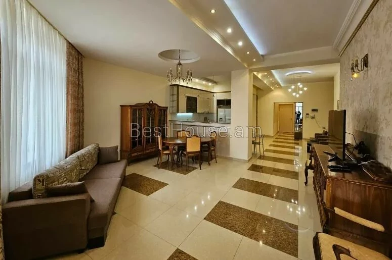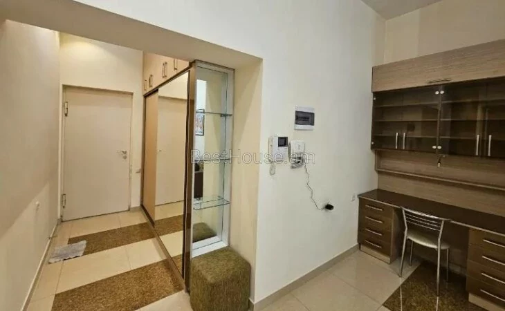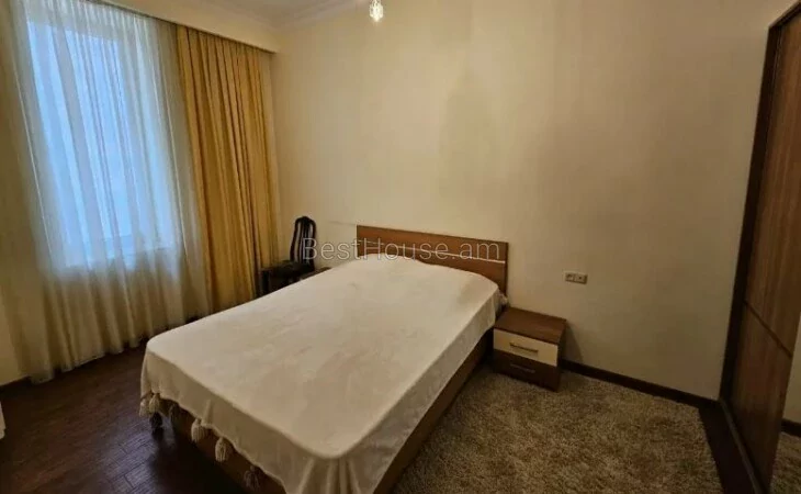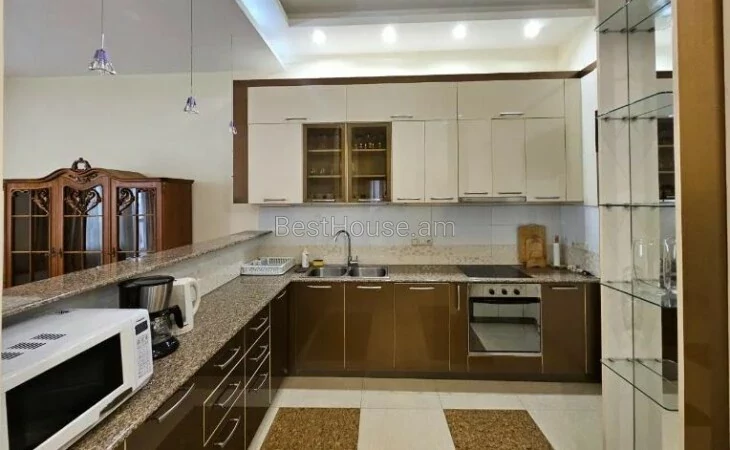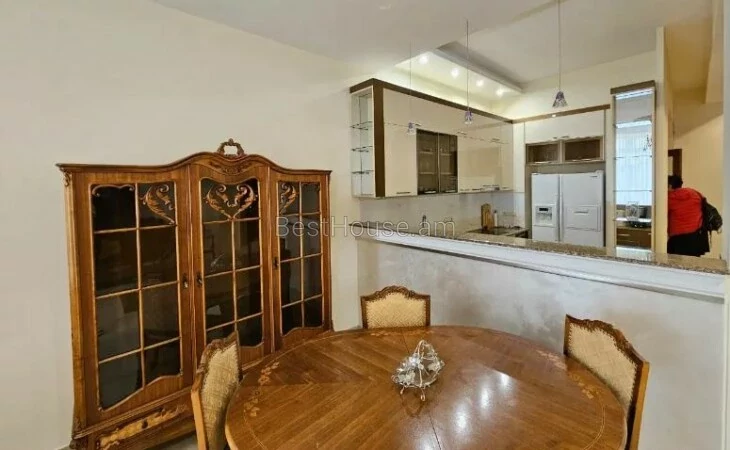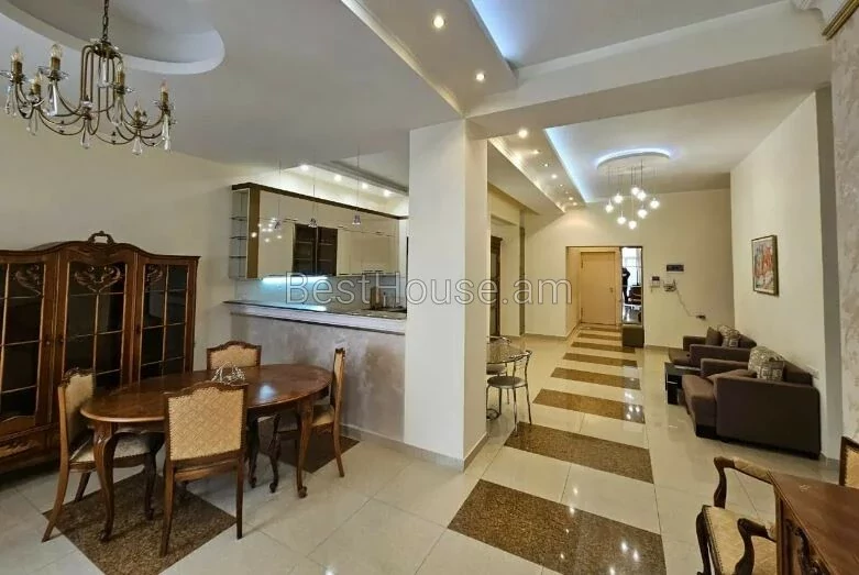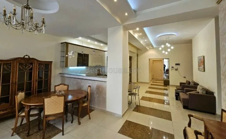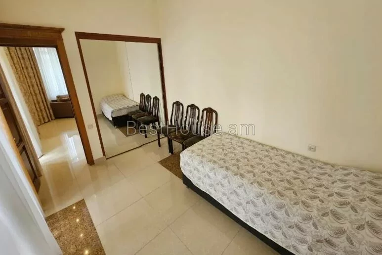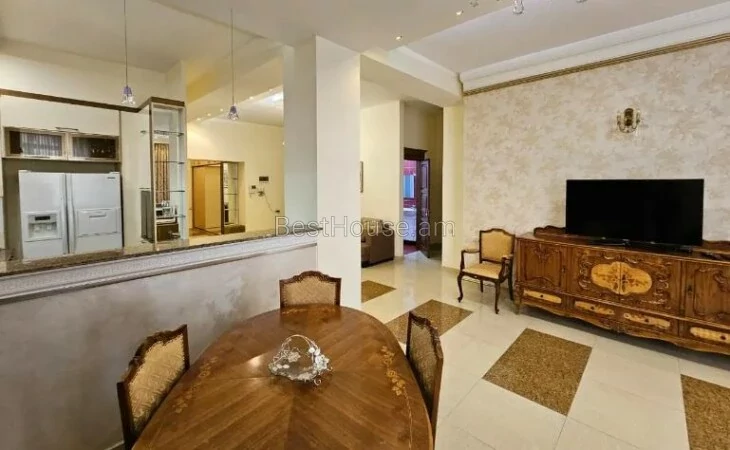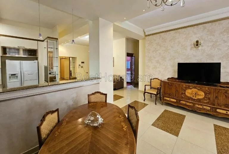 An apartment is for rent on the 8th floor of 5 Kyusisai Ave. The total area of the apartment is 140 square meters, it has 3 bedrooms, 2 bathrooms, kitchen, living room, porch, balcony and 2 storage rooms. At the entrance there are 2 elevators of the OTIS brand that go down directly to the parking lot, where there is a private garage.