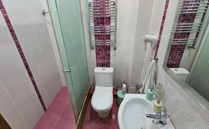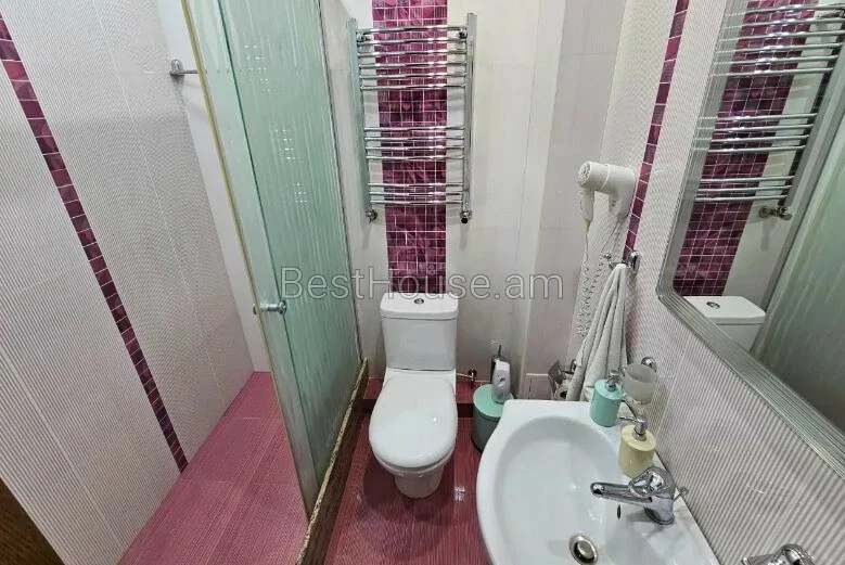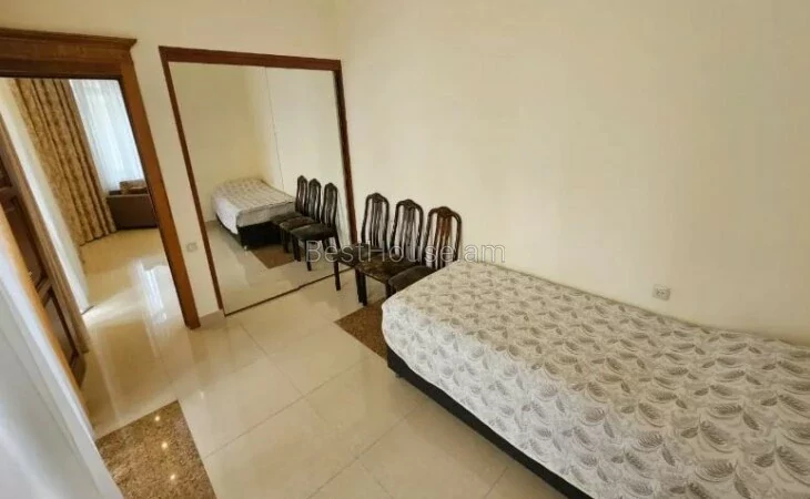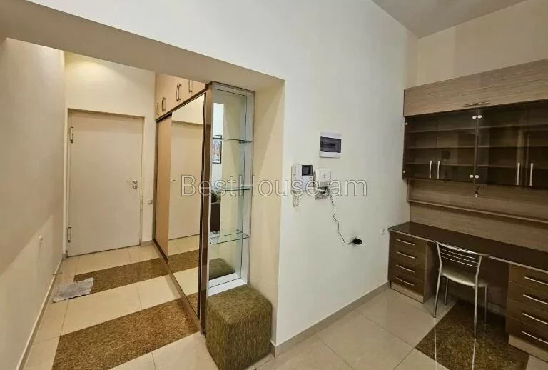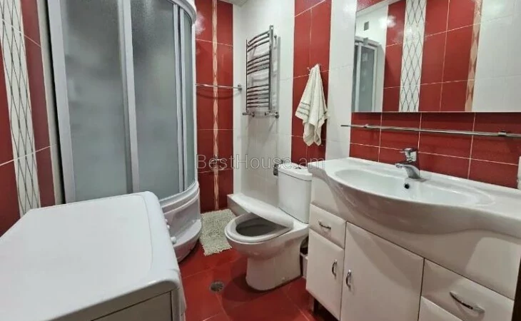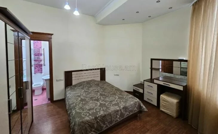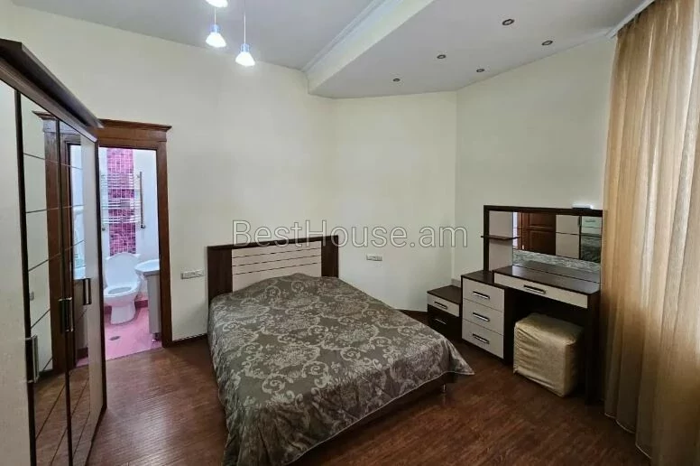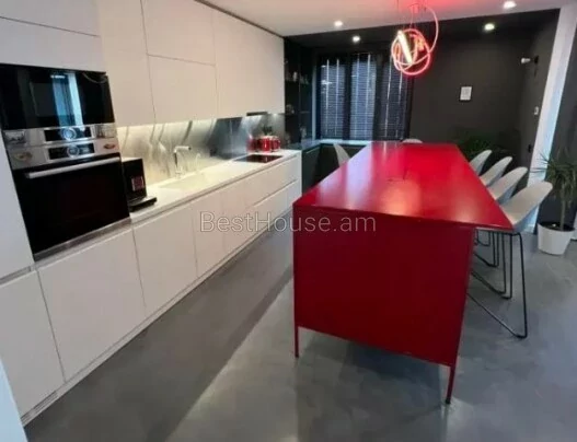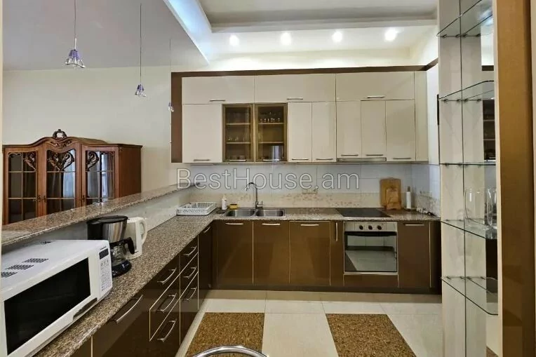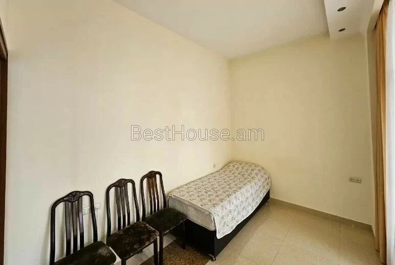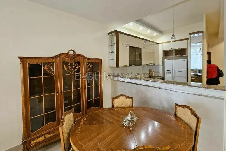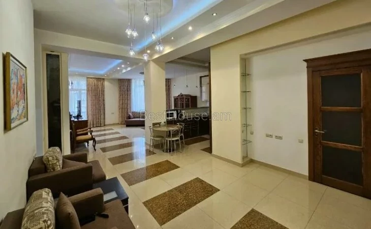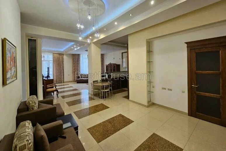 An apartment is for rent on the 8th floor of 5 Kyusisai Ave. The total area of the apartment is 140 square meters, it has 3 bedrooms, 2 bathrooms, kitchen, living room, porch, balcony and 2 storage rooms. At the entrance there are 2 elevators of the OTIS brand that go down directly to the parking lot, where there is a private garage.
