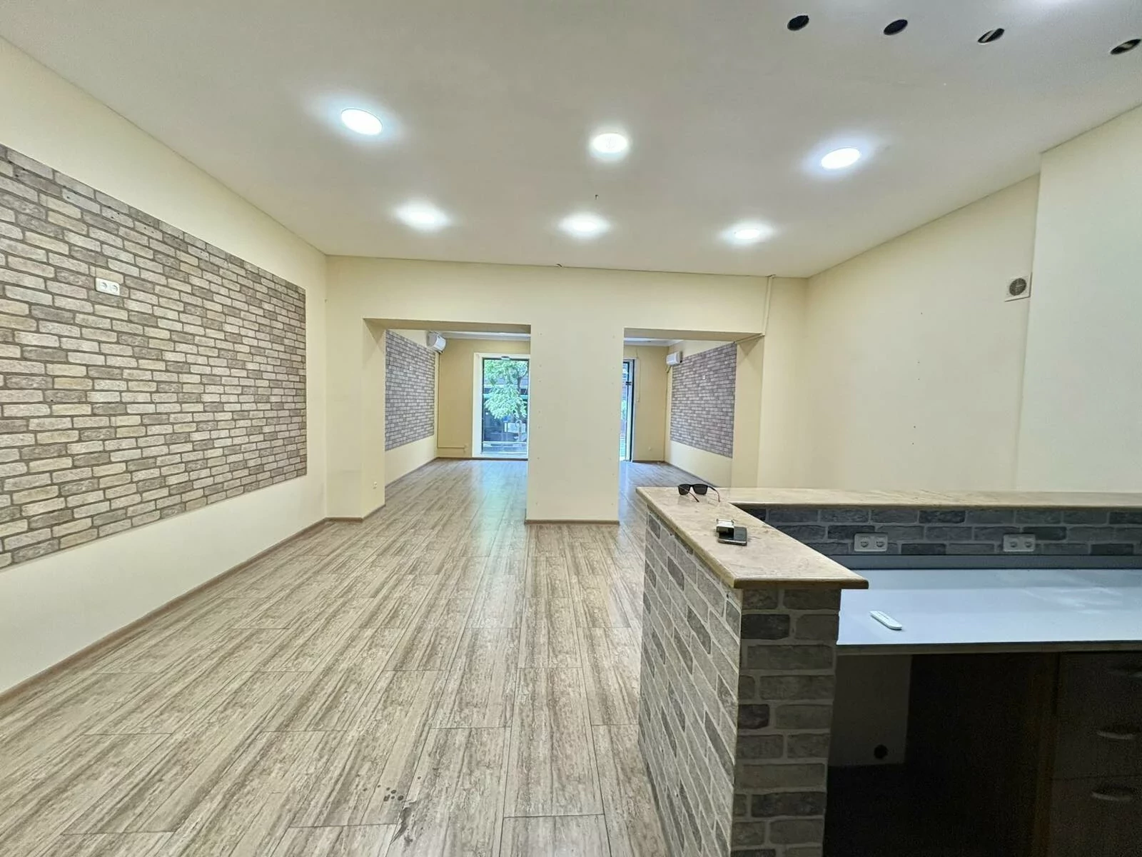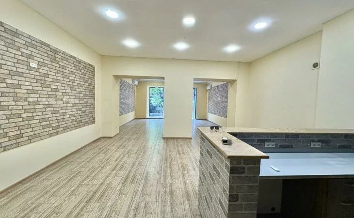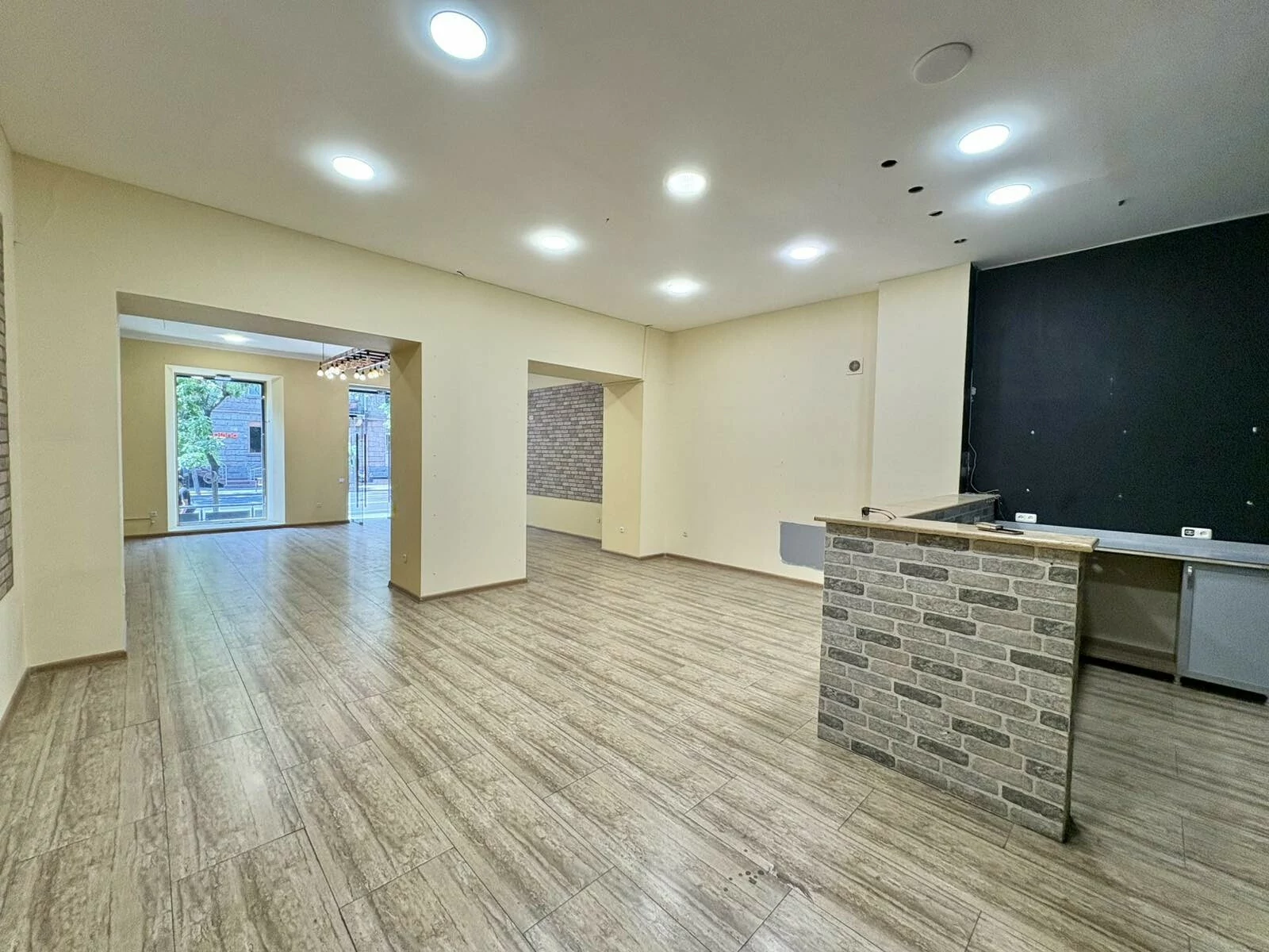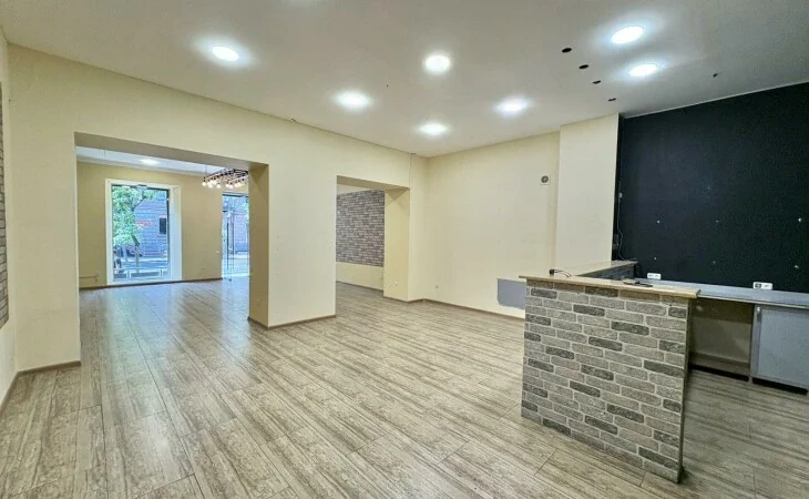 Commercial space (110 sq m) is for rent, located at the Mashtots-Khorenatsi intersection. The space has a wide frontage, high windows, and has cooling and heating systems. The space is located on the first line, in a busy part of the street. It has 2 bathrooms and a parking space in the yard. It is suitable for any activity.