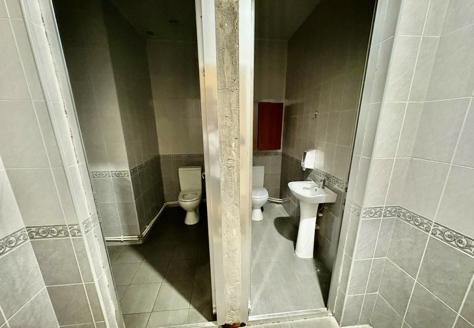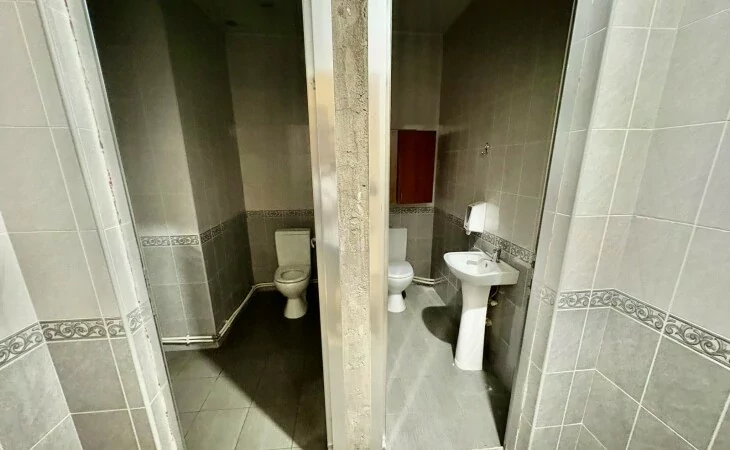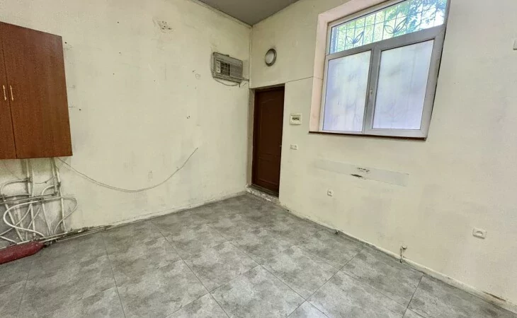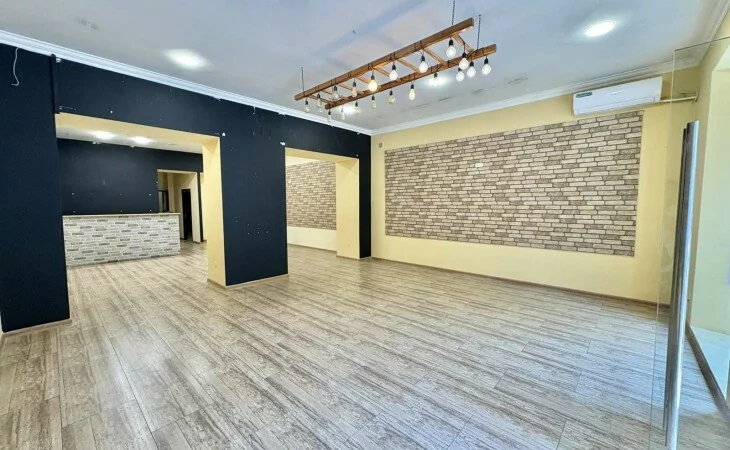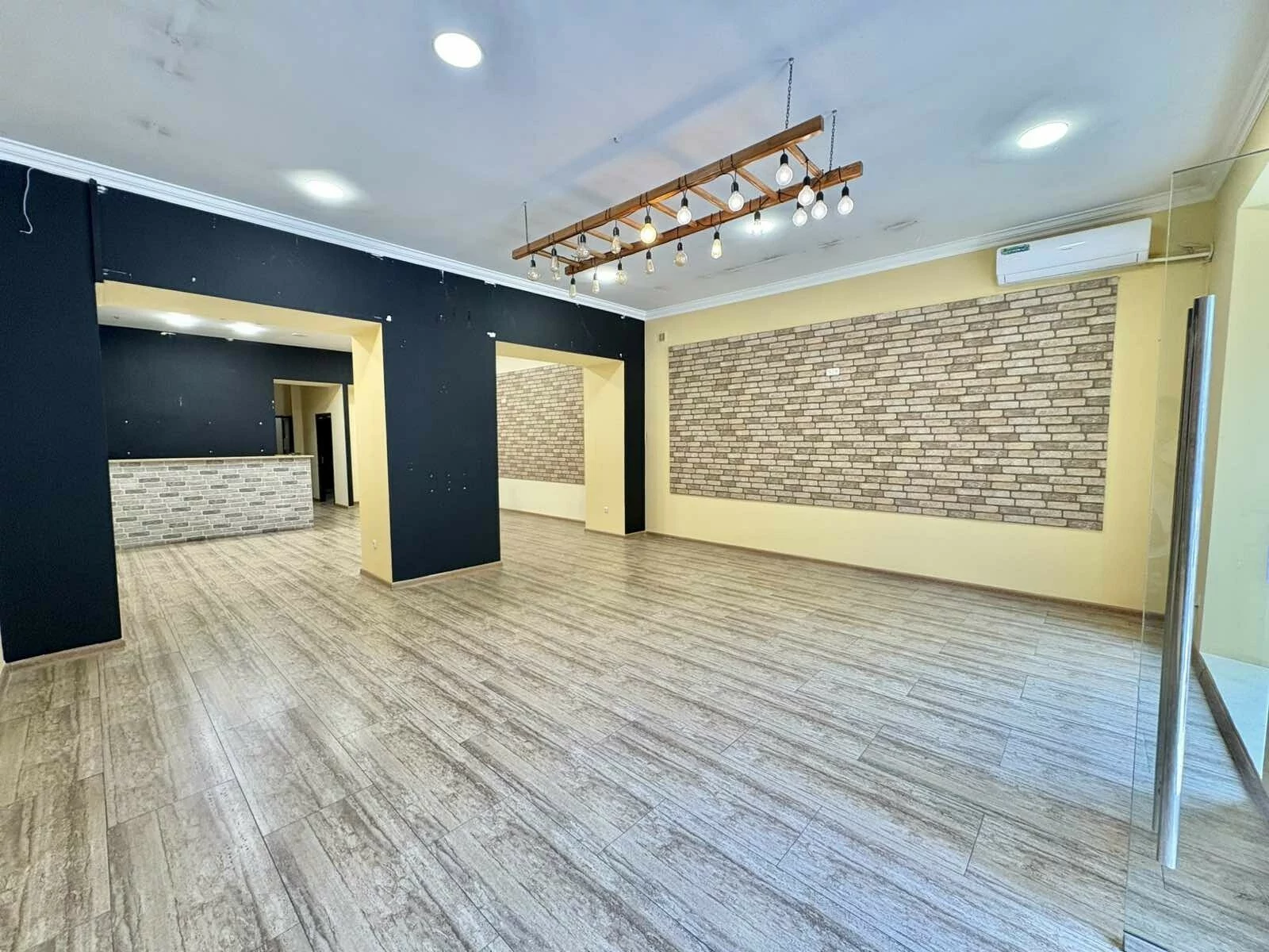 Commercial space (110 sq m) is for rent, located at the Mashtots-Khorenatsi intersection. The space has a wide frontage, high windows, and has cooling and heating systems. The space is located on the first line, in a busy part of the street. It has 2 bathrooms and a parking space in the yard. It is suitable for any activity.