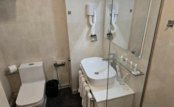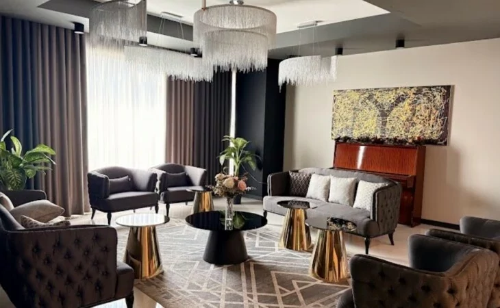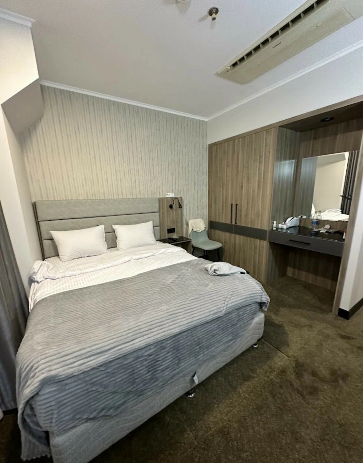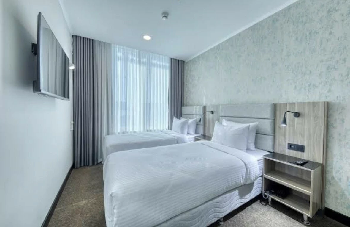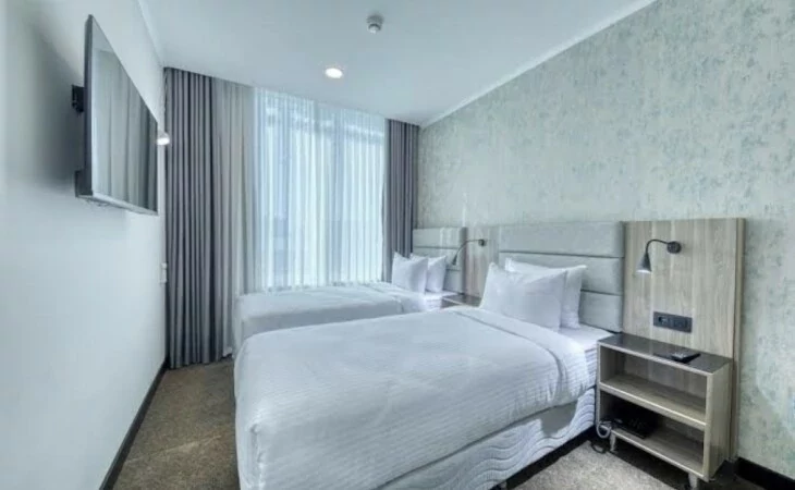 A 68-room hotel with all amenities is for rent. It has a restaurant area, several kitchens, a swimming pool, a sauna. Heating and cooling are provided by a fan coil system.