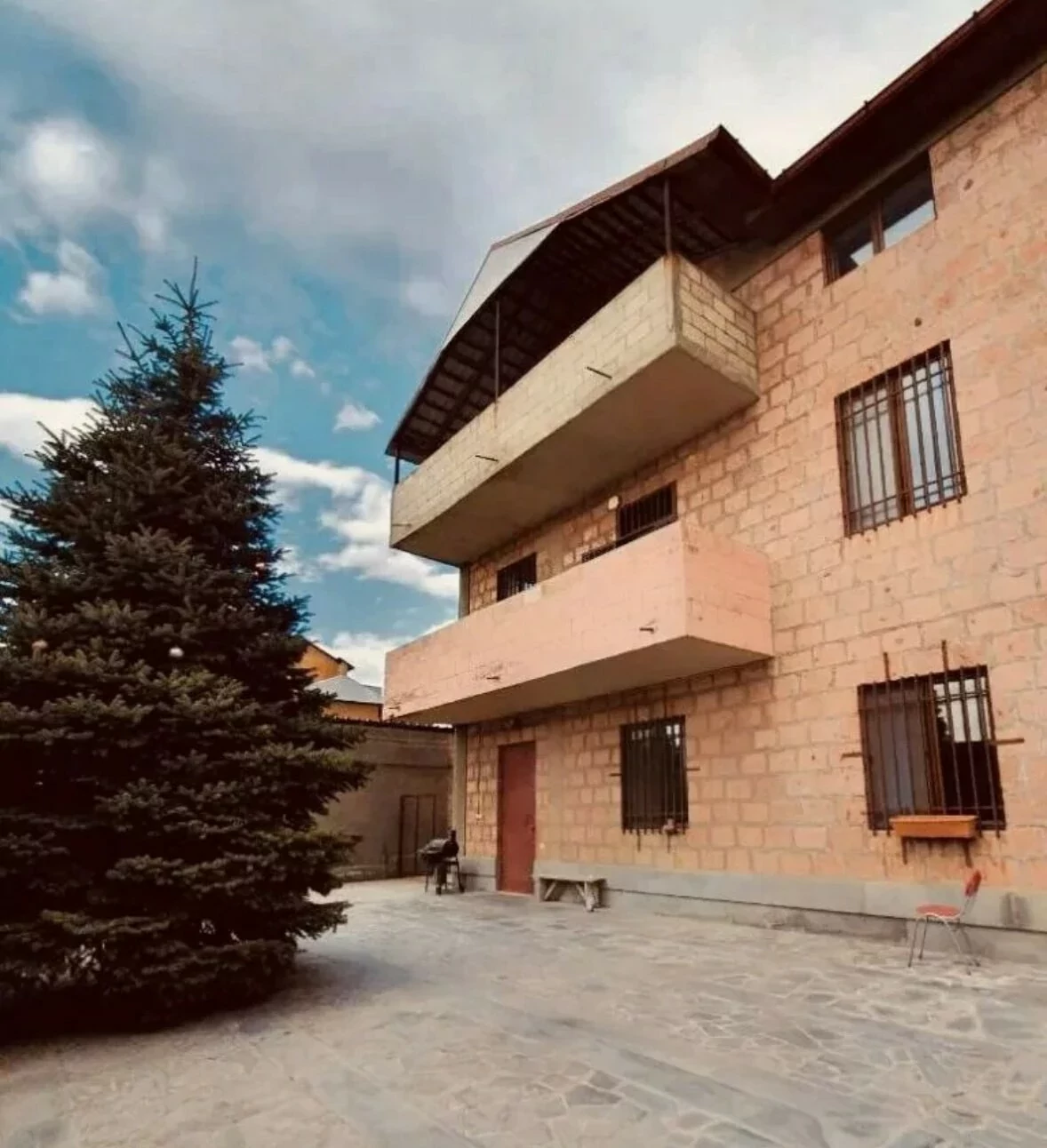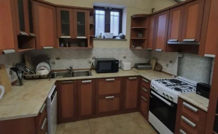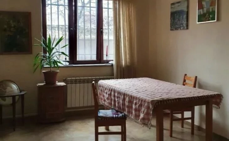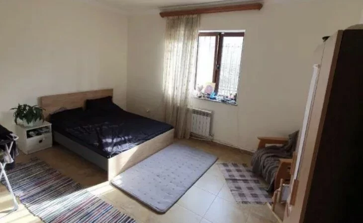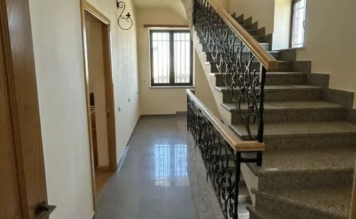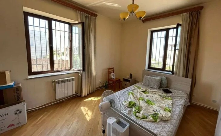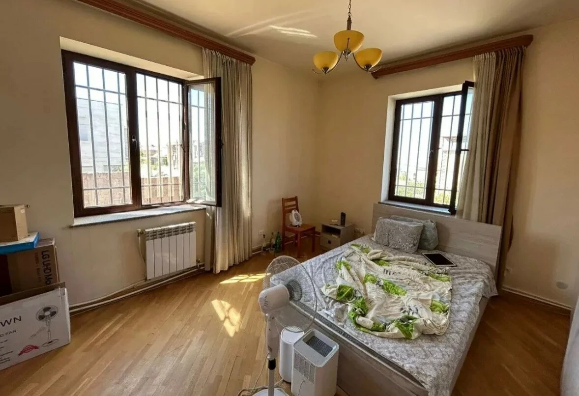 A house is for rent in Yerevan. The house has 7 rooms: 4 bedrooms, 2 living rooms, a dining room, a kitchen, three bathrooms, and two balconies. The house has all the utilities, euro renovation, a Baxi system, wifi, a washing machine, and dishes. There is a garden. The area of the house is 300 square meters. The area of the garden is 1000 square meters.