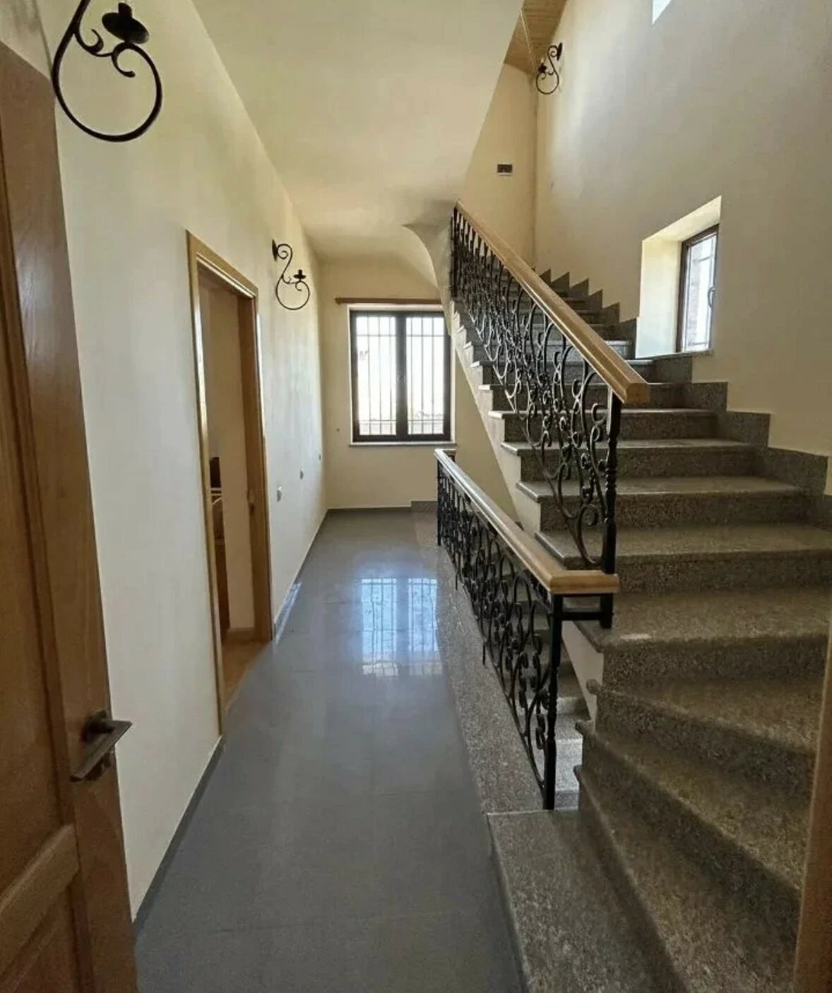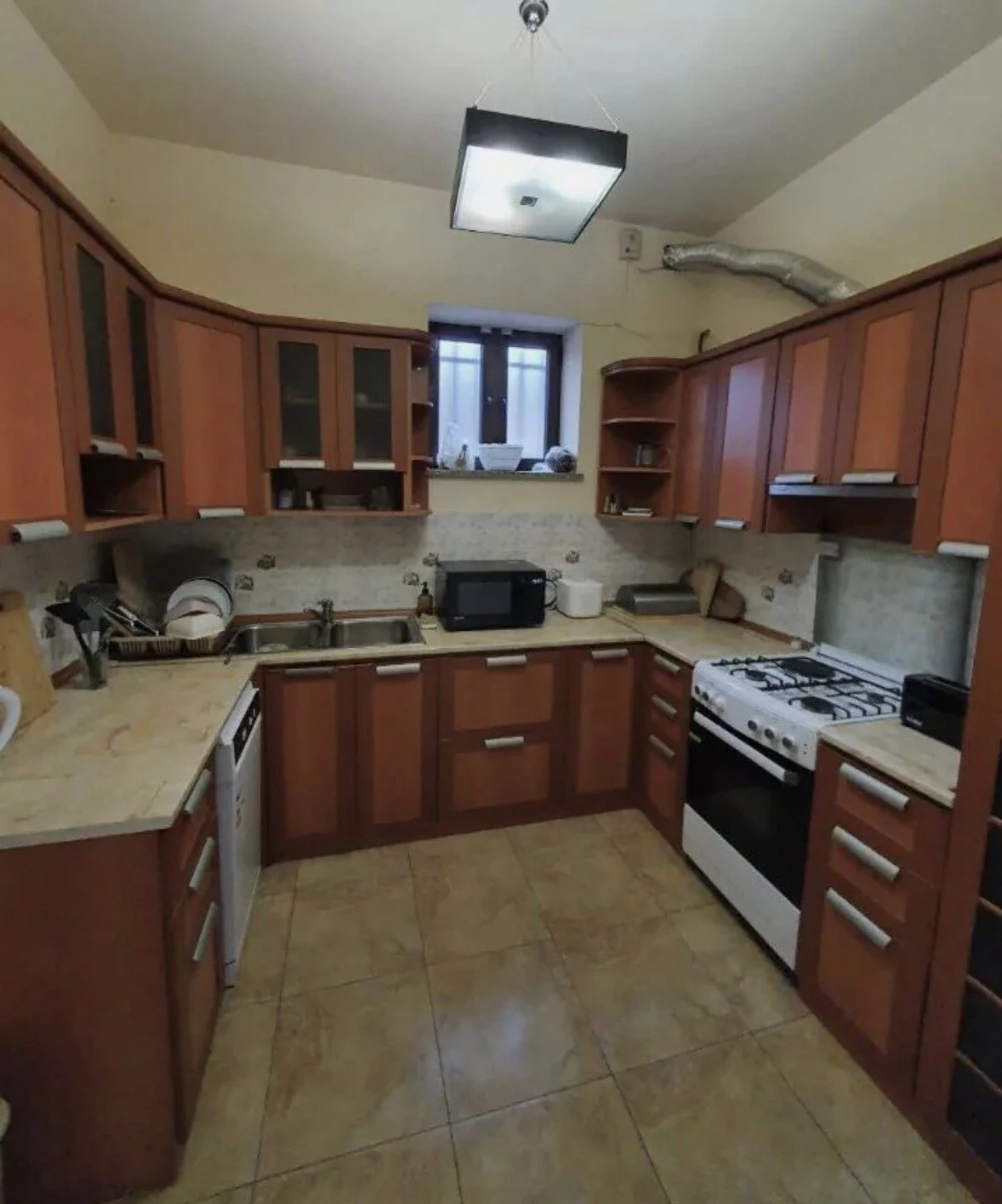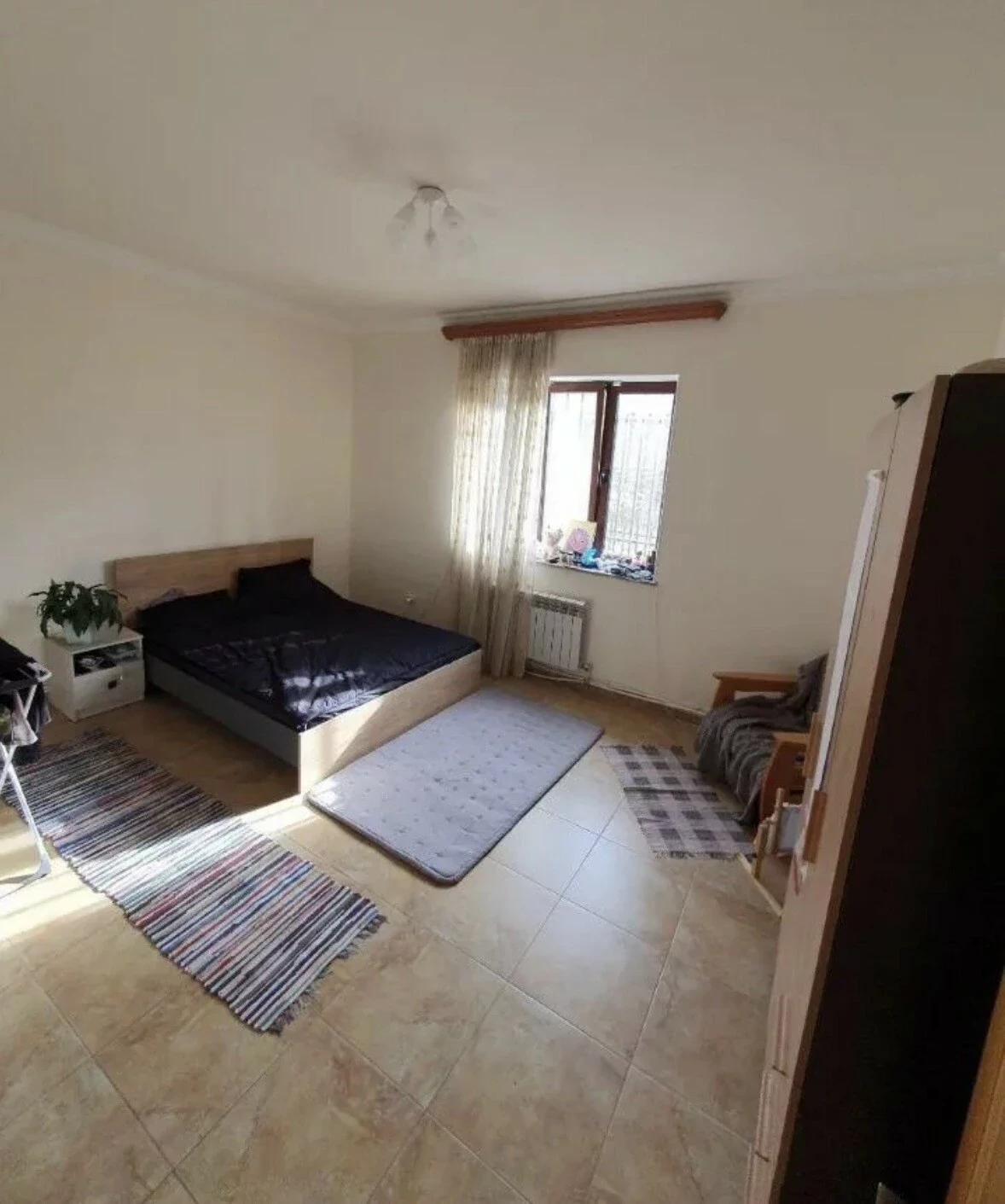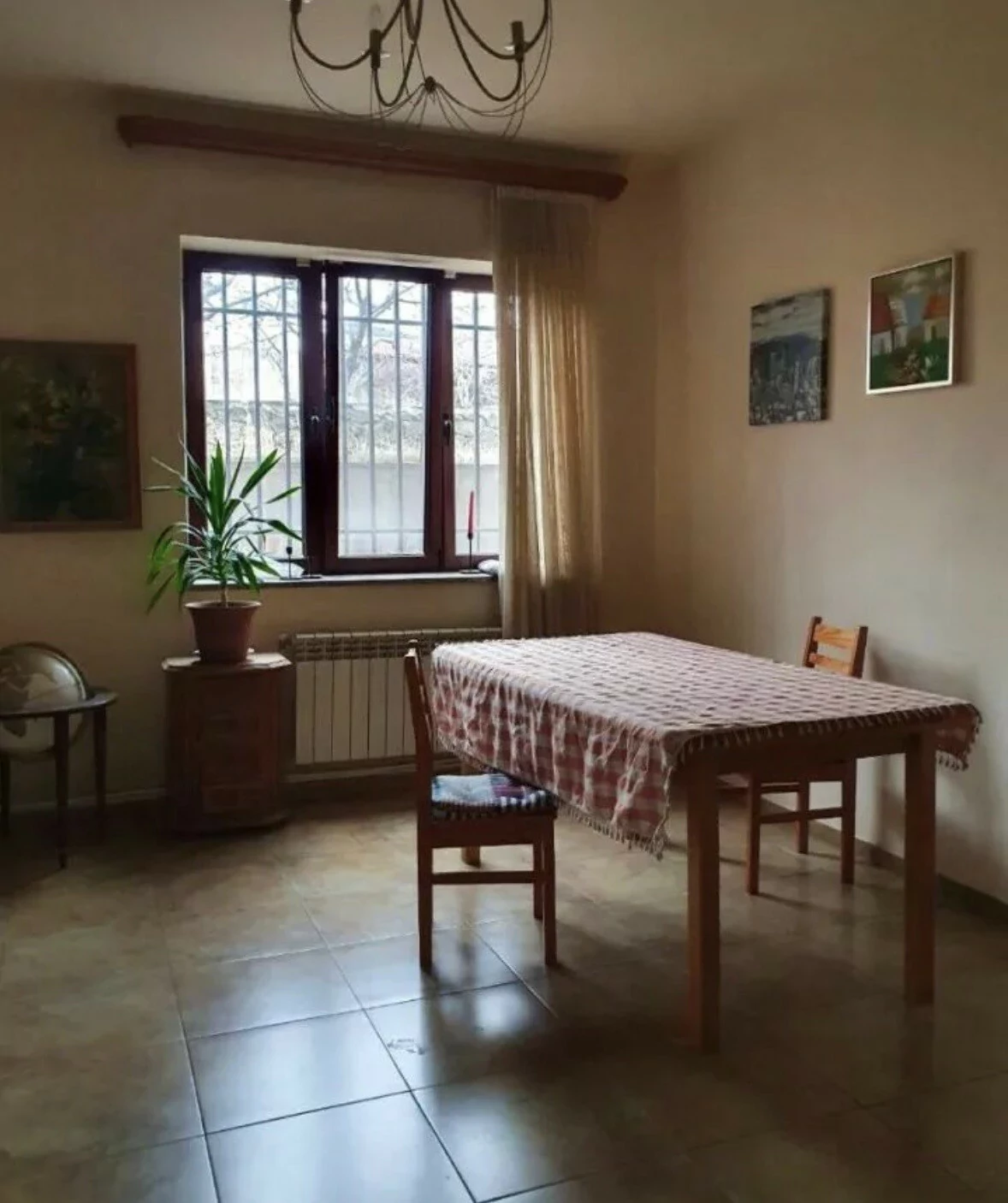 A house is for rent in Yerevan. The house has 7 rooms: 4 bedrooms, 2 living rooms, a dining room, a kitchen, three bathrooms, and two balconies. The house has all the utilities, euro renovation, a Baxi system, wifi, a washing machine, and dishes. There is a garden. The area of the house is 300 square meters. The area of the garden is 1000 square meters.