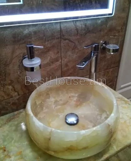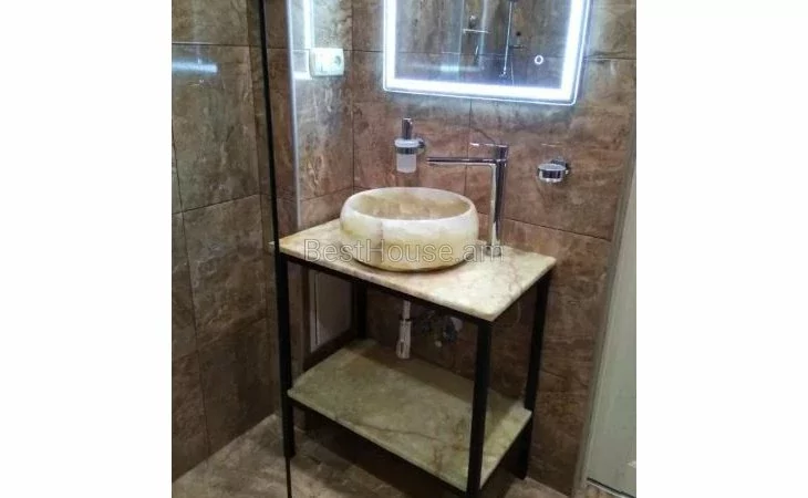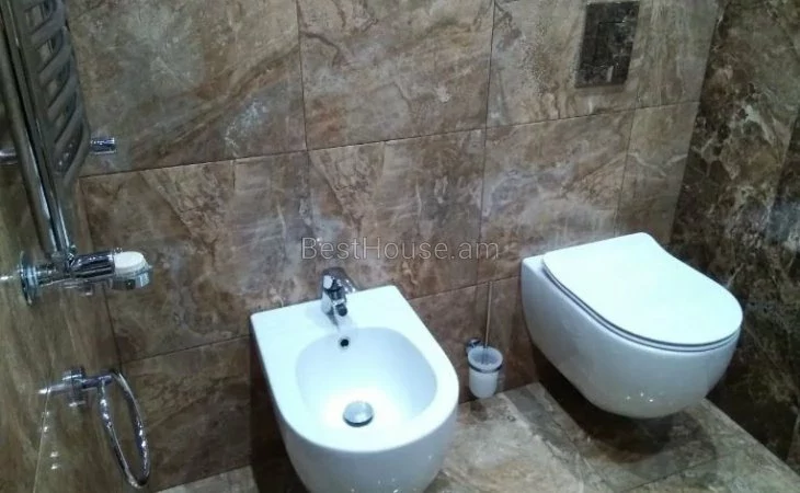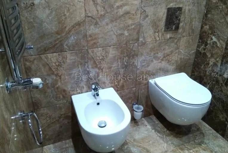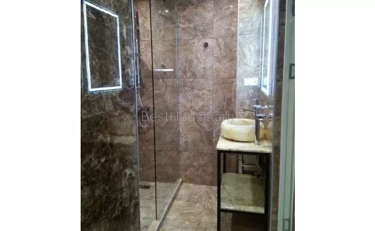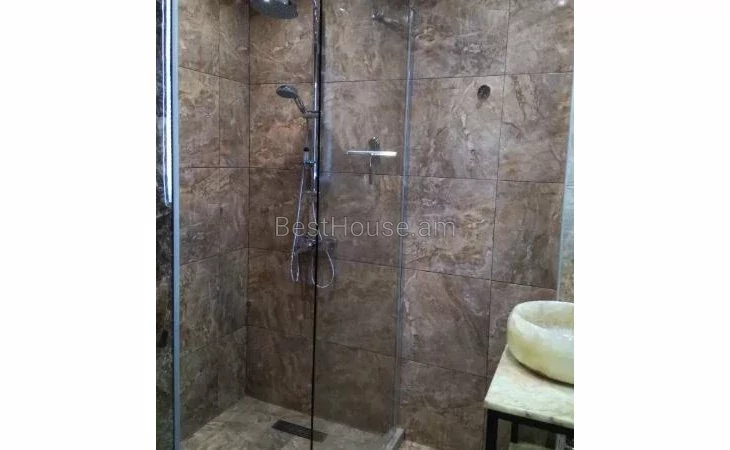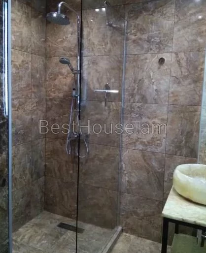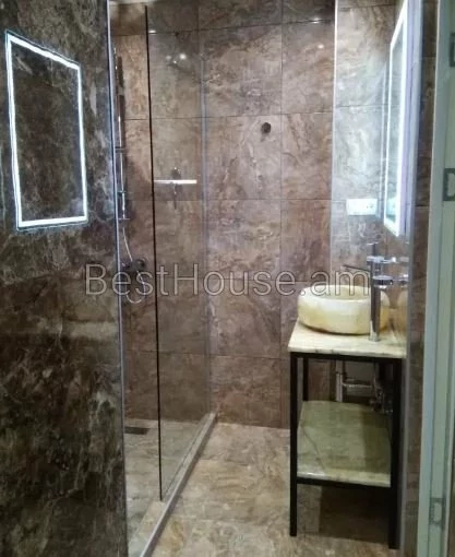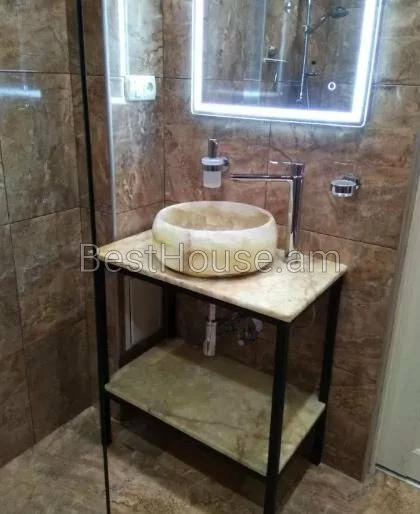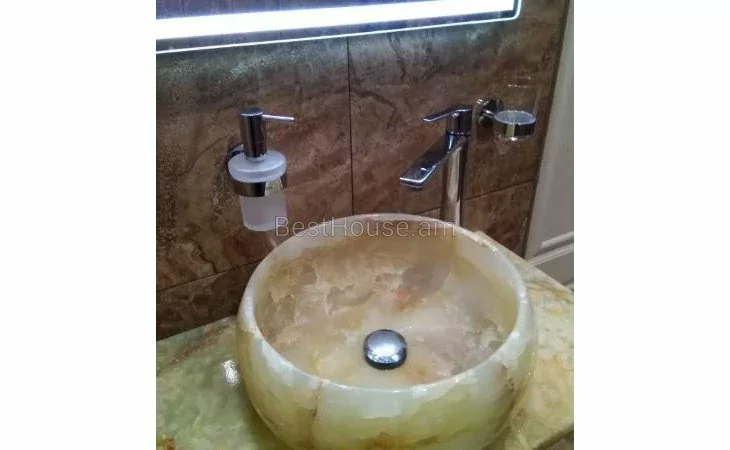 Ապակիով առանձնացված լոգարանը հագեցած է անձրևային ցնցուղի գլխիկով և բաղնիքի արժեքավոր ծորակով։ Լվացարանը պատրաստված է բնական քարից՝ օնիքսից։ Սանհանգույցում առկա է լվացքի մեքենա։ Բնակելի շենքը ապահովված է շուրջօրյա ջրամատակարարմամբ և գազամատակարարմամբ: