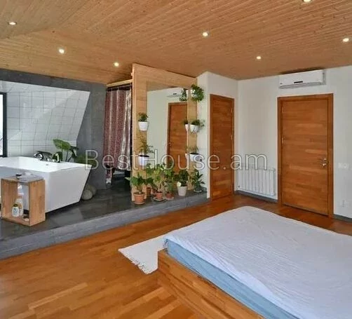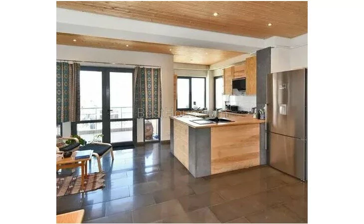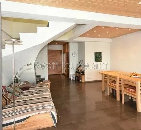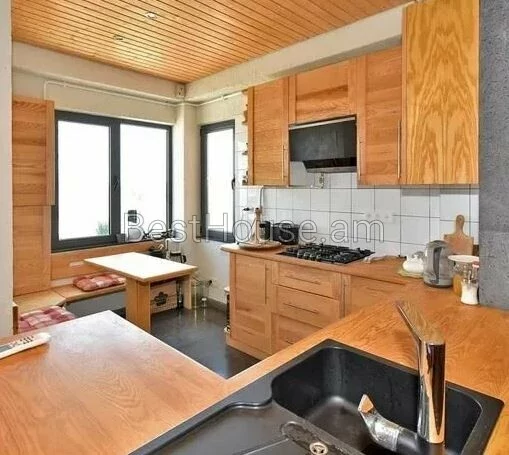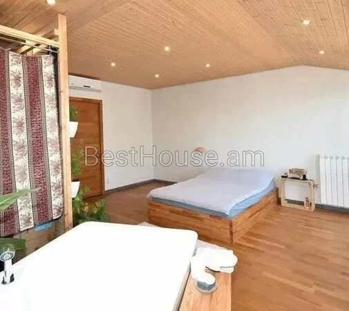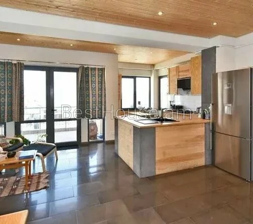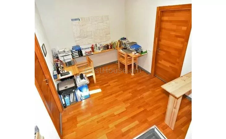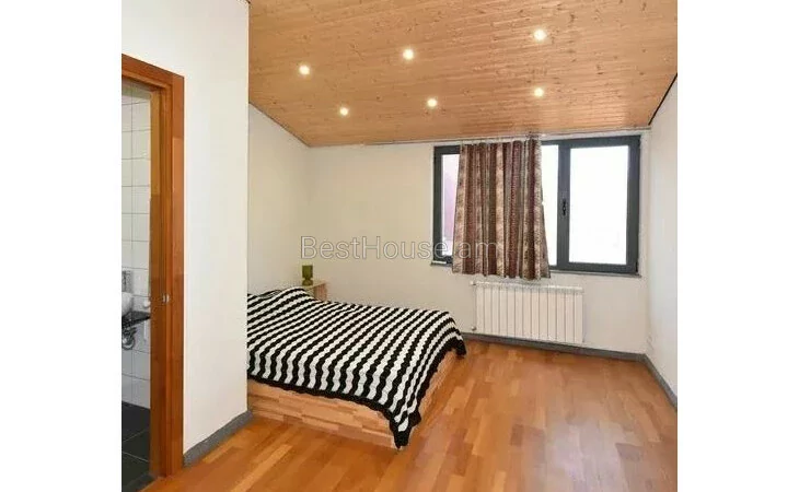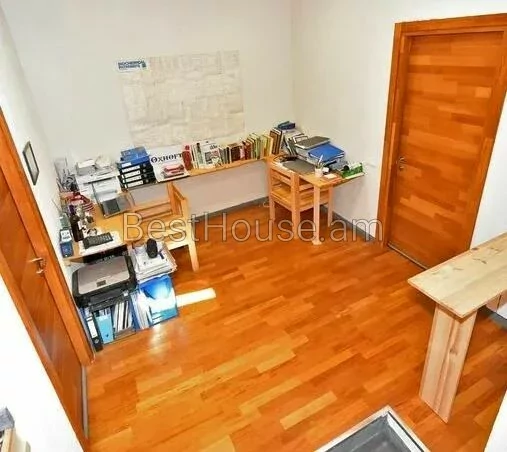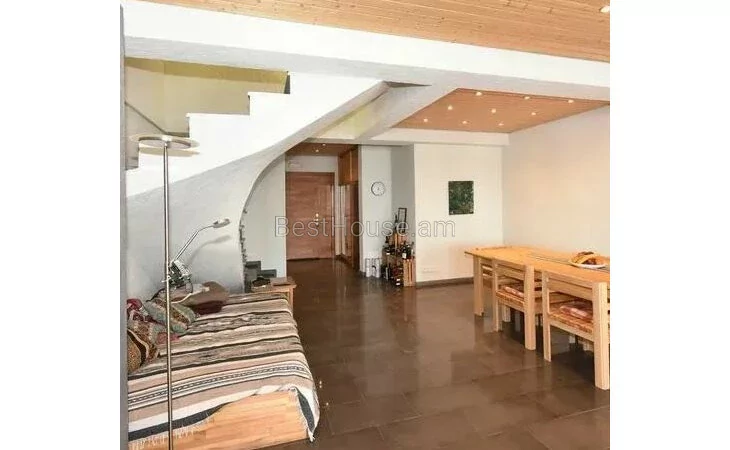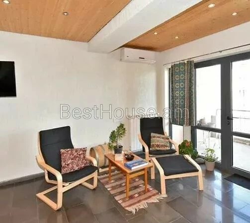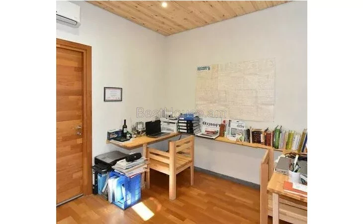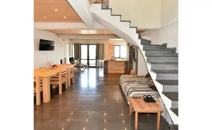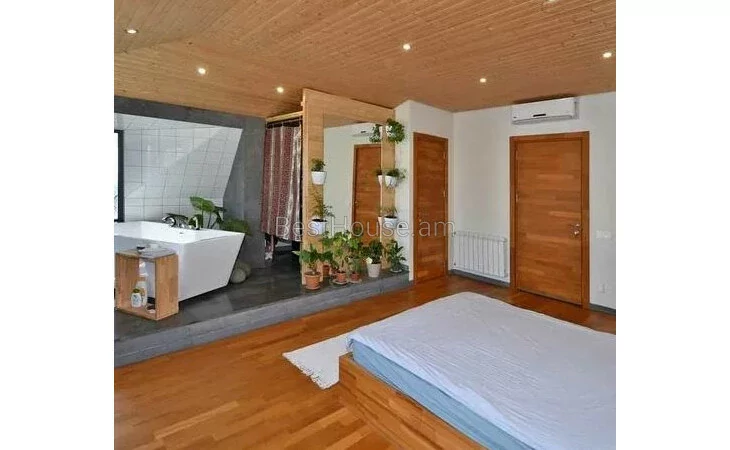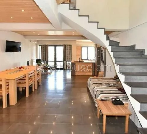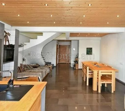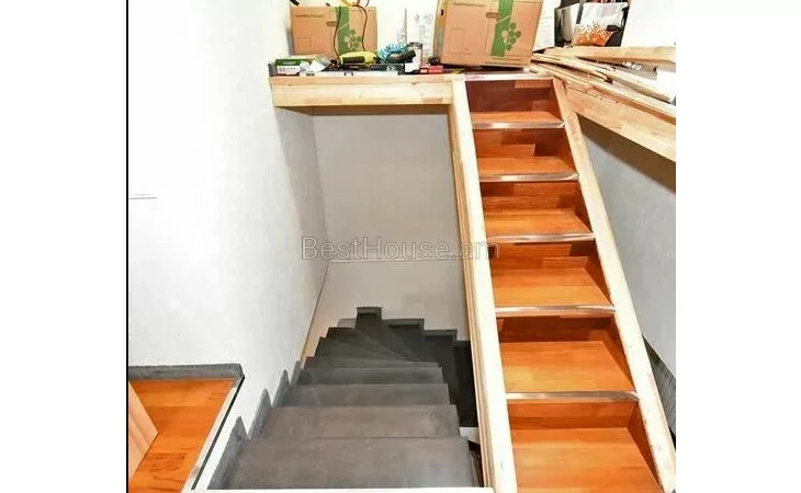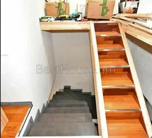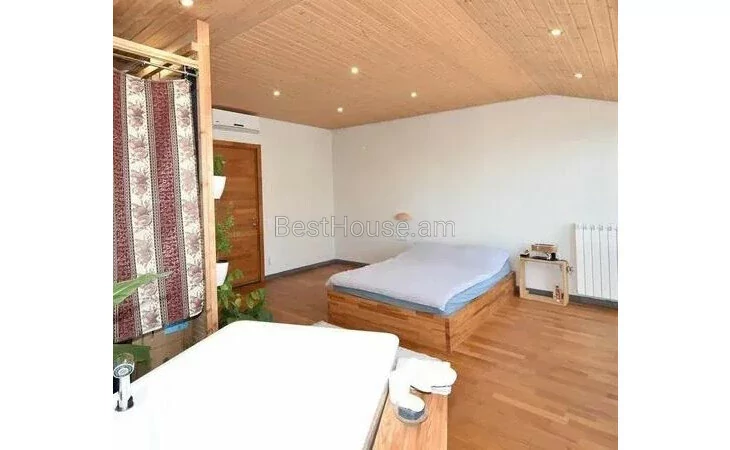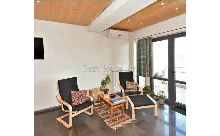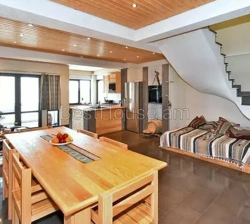 A modern living with Scandinavian style in mind. The flat is a duplex. There are two sleeping rooms with separate bathrooms, an office area combined with space for a library. The first floor is covered with natural polished basalt stones, with floor-heating and combined radiators. The second floor is natural wooden parquet. Each room is equipped with radiators and air-conditioning. Furniture is hand-made, with natural wood. The flat has a cozy, bright atmosphere. The balcony is facing east, southeast. It has a nice view to Ararat, with ten minutes to Cascade.