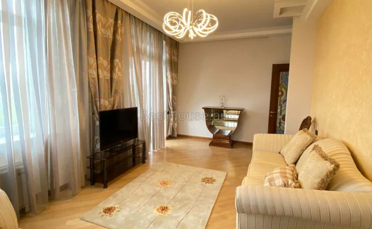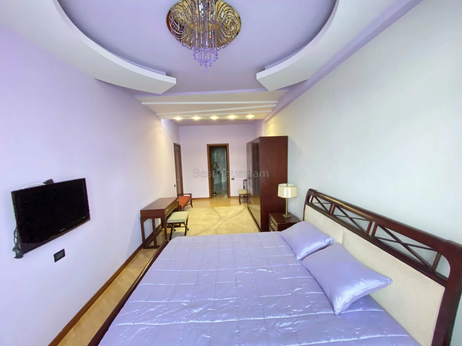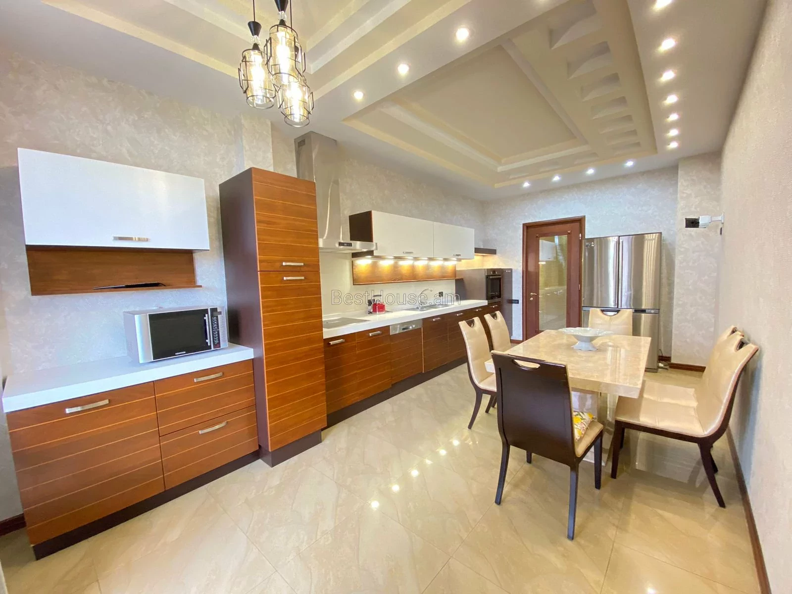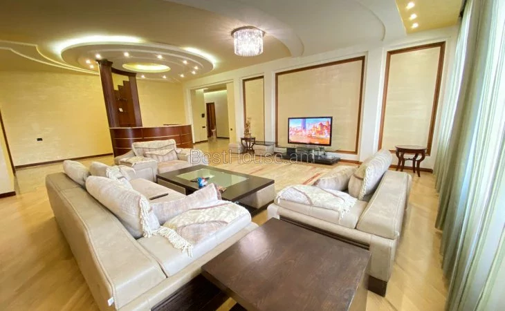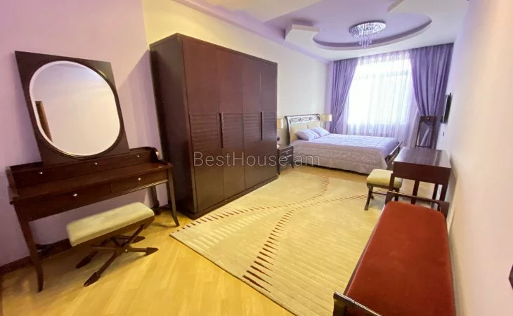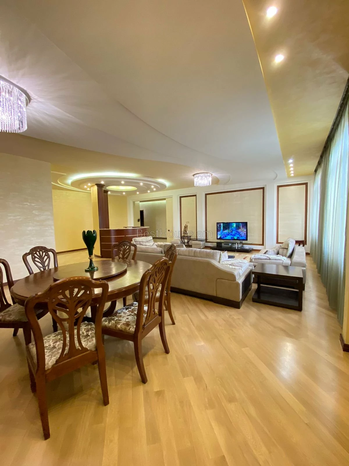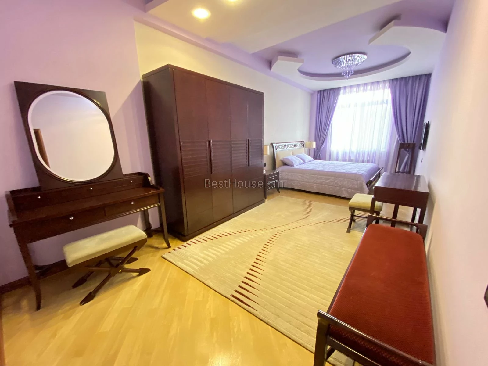 A 5-room apartment is for rent in the Center, in a newly built Elite building. The apartment is equipped with all utilities, furniture and appliances. The apartment has a beautiful view. The apartment has - 3 bedrooms, - 1 living room, - 1 rest room, - 1 separate kitchen, - 3 bathrooms. There is also a dishwasher and a microwave oven. There is a swimming pool and gym in the building. A garage for 2 cars is provided with the apartment.