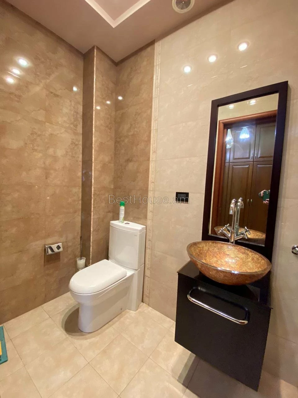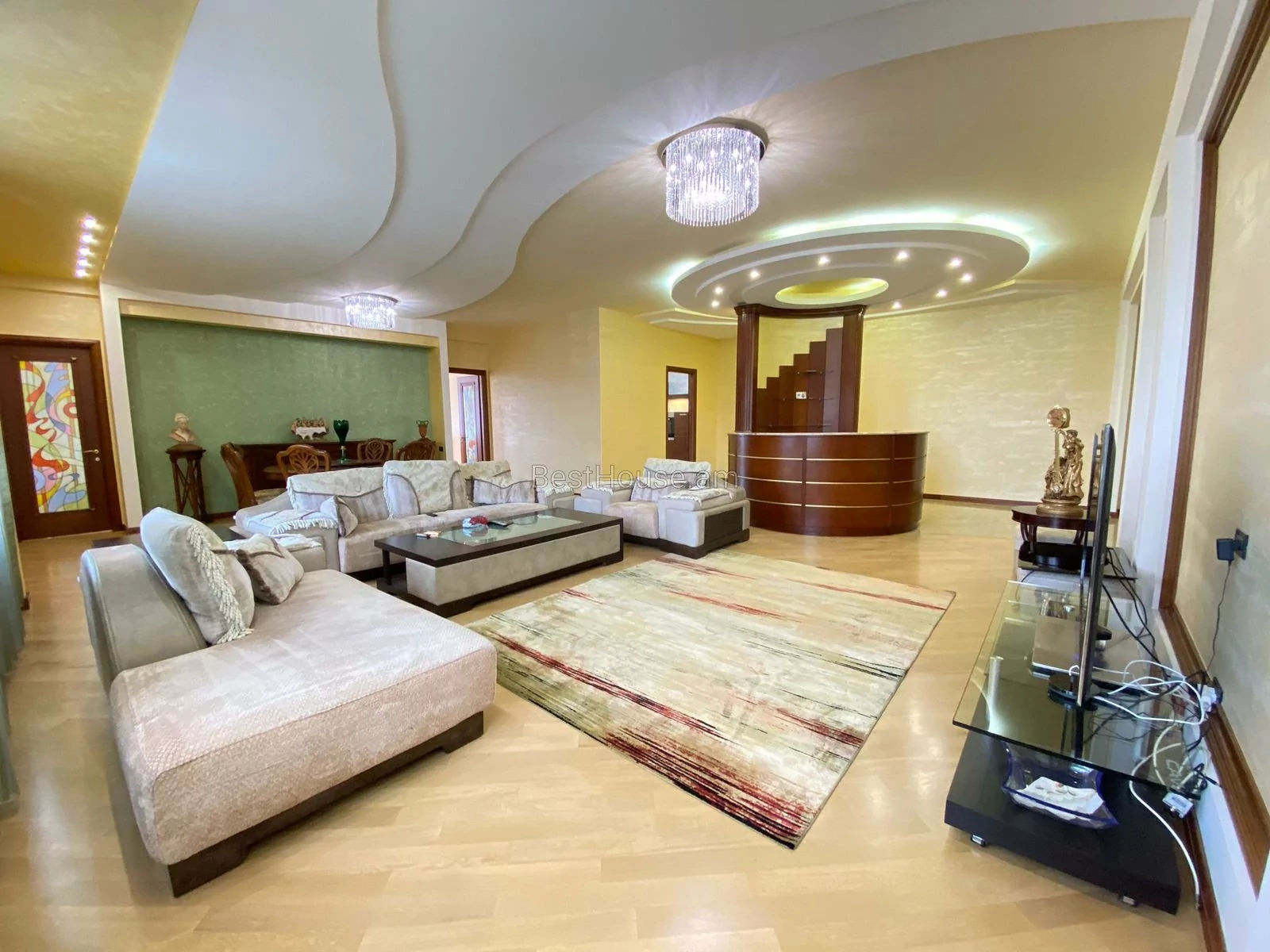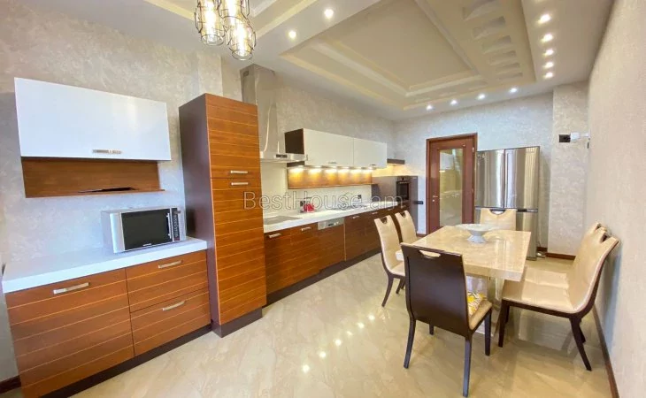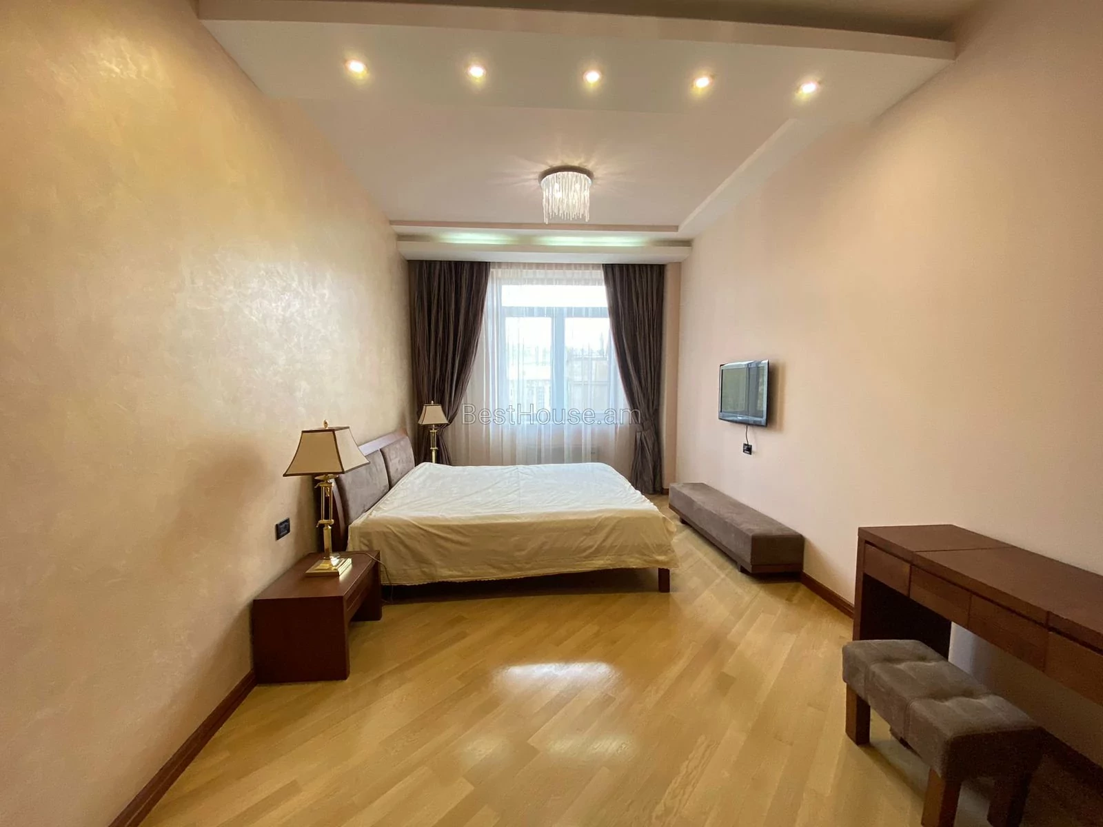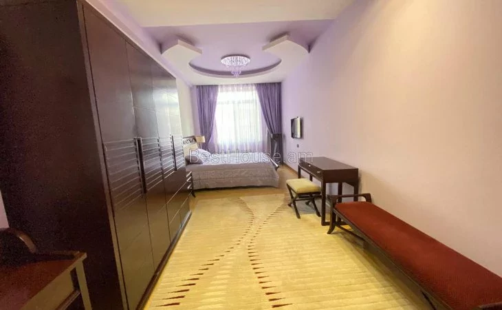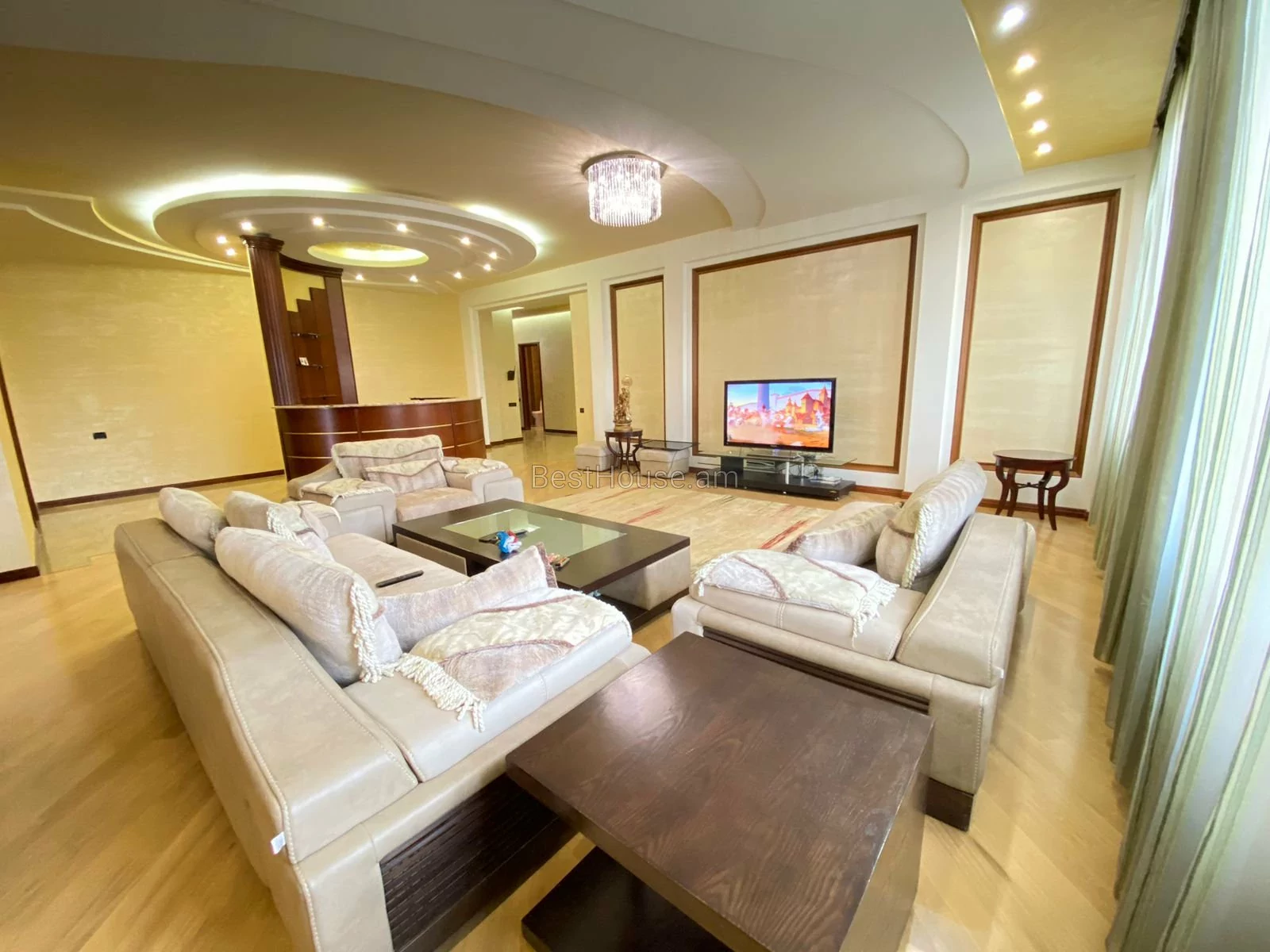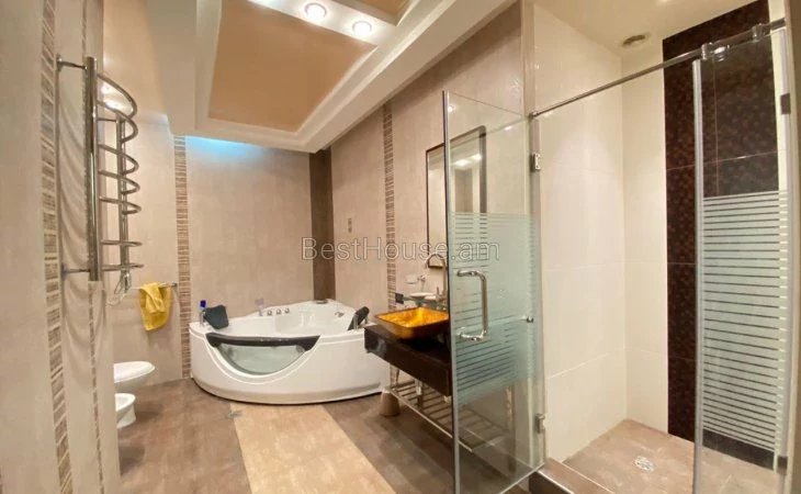 A 5-room apartment is for rent in the Center, in a newly built Elite building. The apartment is equipped with all utilities, furniture and appliances. The apartment has a beautiful view. The apartment has - 3 bedrooms, - 1 living room, - 1 rest room, - 1 separate kitchen, - 3 bathrooms. There is also a dishwasher and a microwave oven. There is a swimming pool and gym in the building. A garage for 2 cars is provided with the apartment.