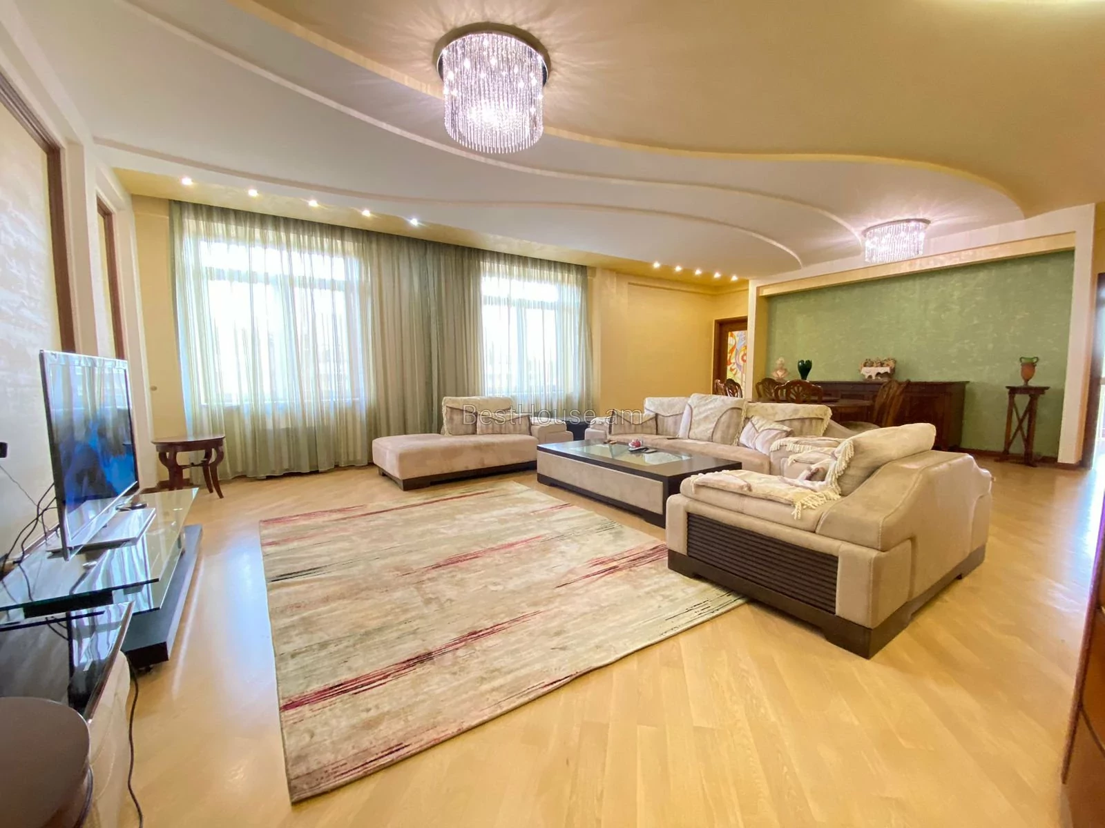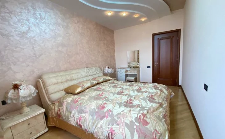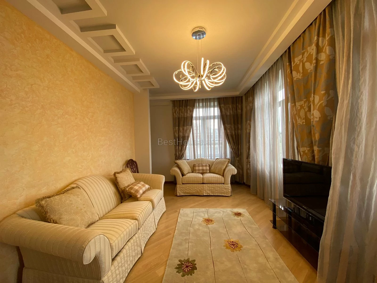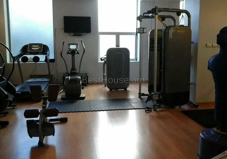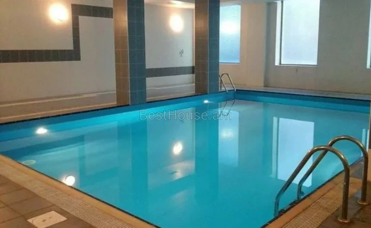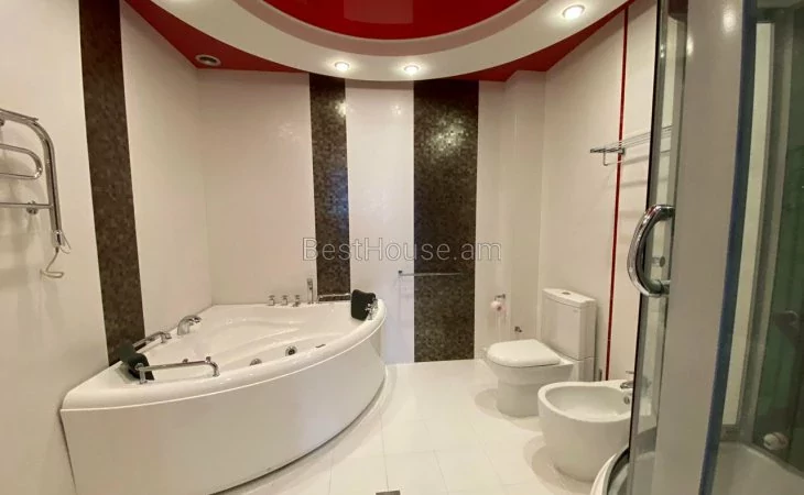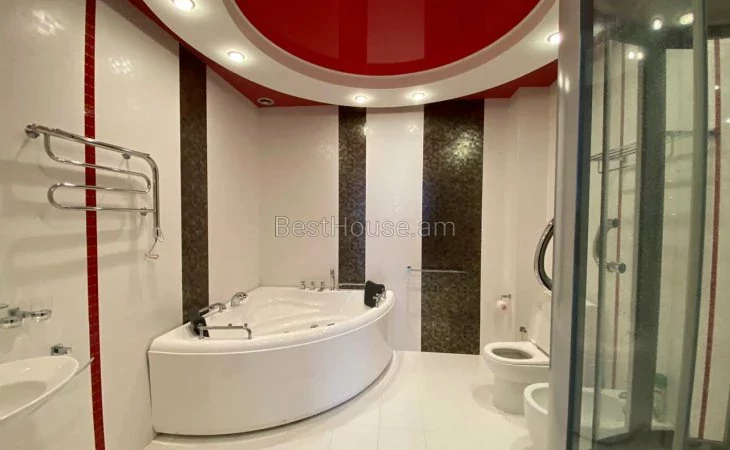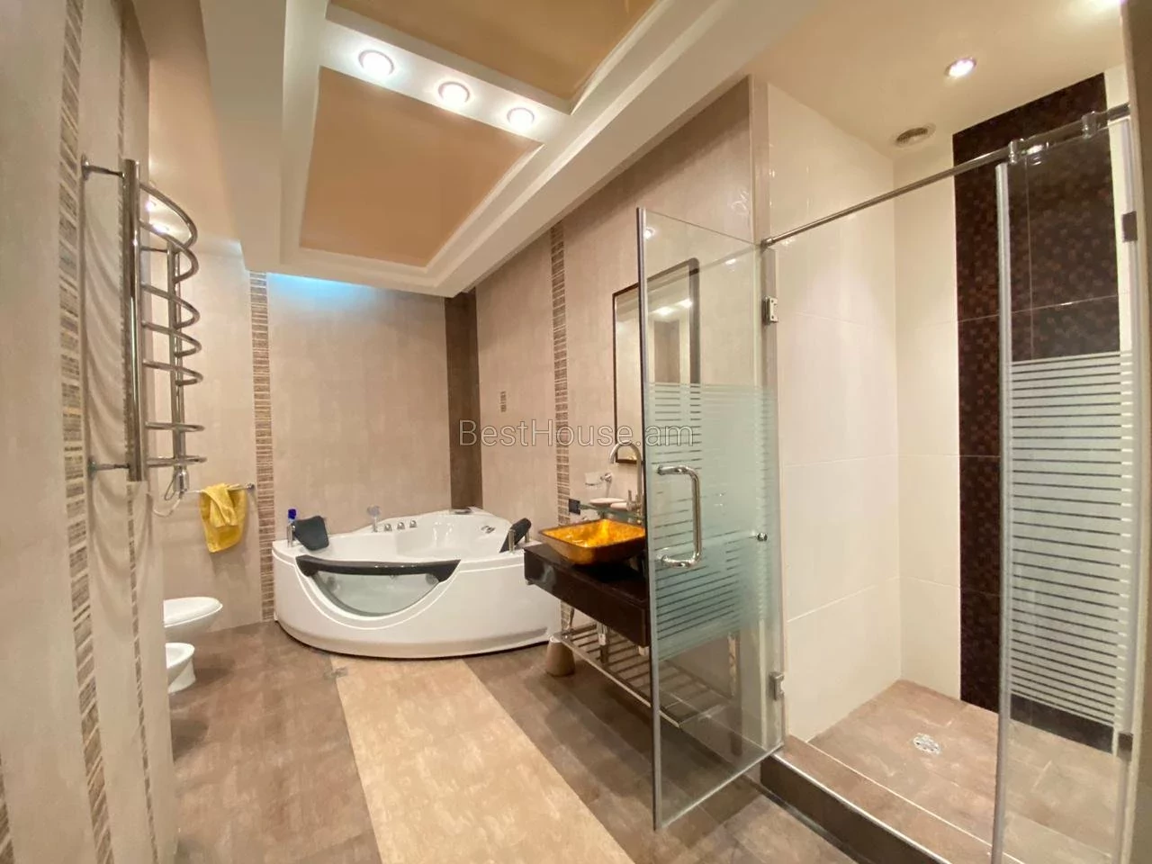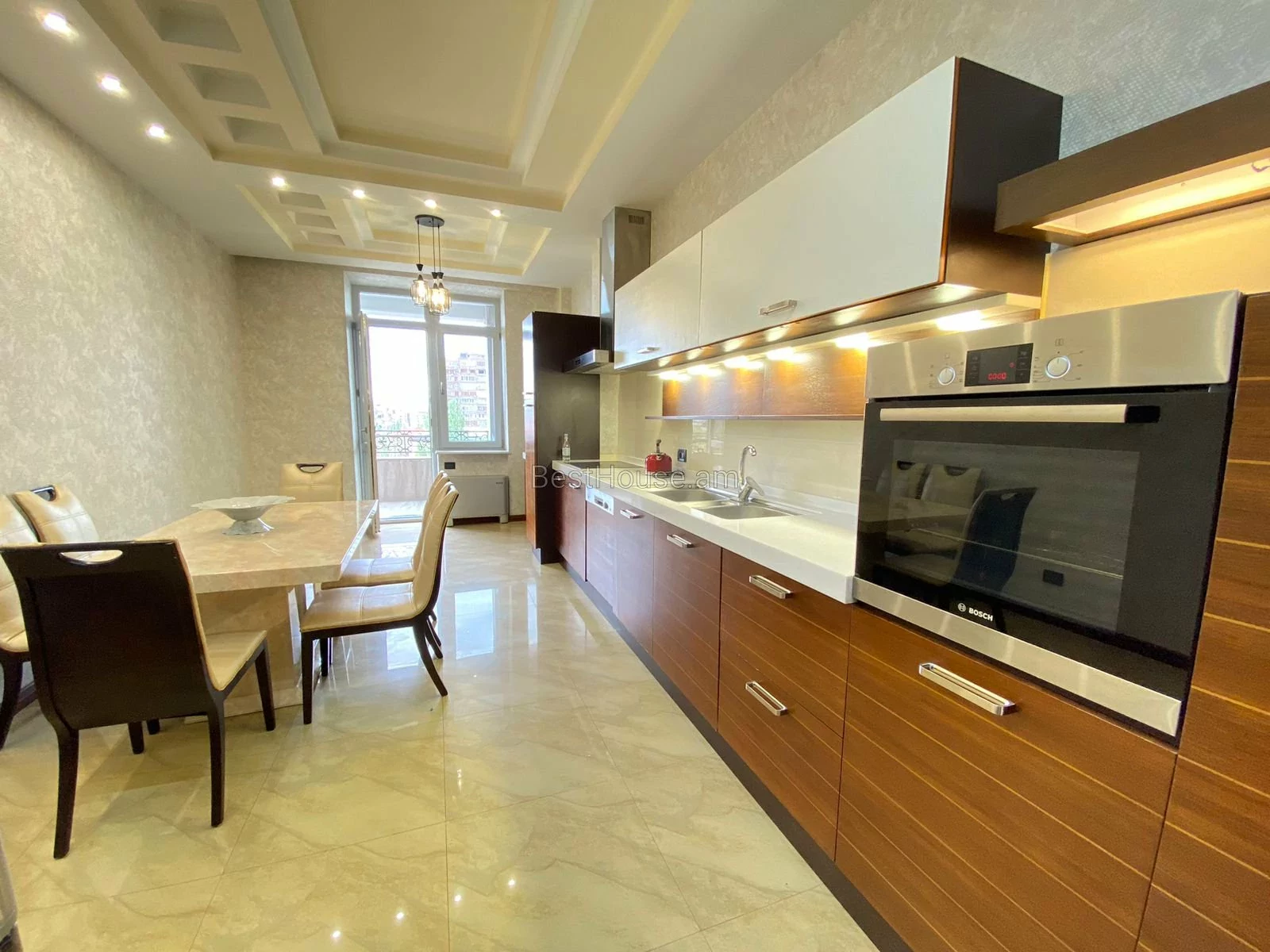 A 5-room apartment is for rent in the Center, in a newly built Elite building. The apartment is equipped with all utilities, furniture and appliances. The apartment has a beautiful view. The apartment has - 3 bedrooms, - 1 living room, - 1 rest room, - 1 separate kitchen, - 3 bathrooms. There is also a dishwasher and a microwave oven. There is a swimming pool and gym in the building. A garage for 2 cars is provided with the apartment.