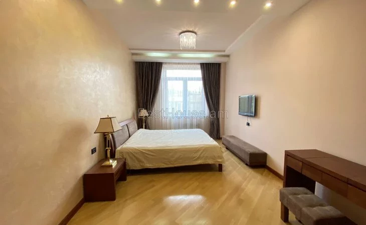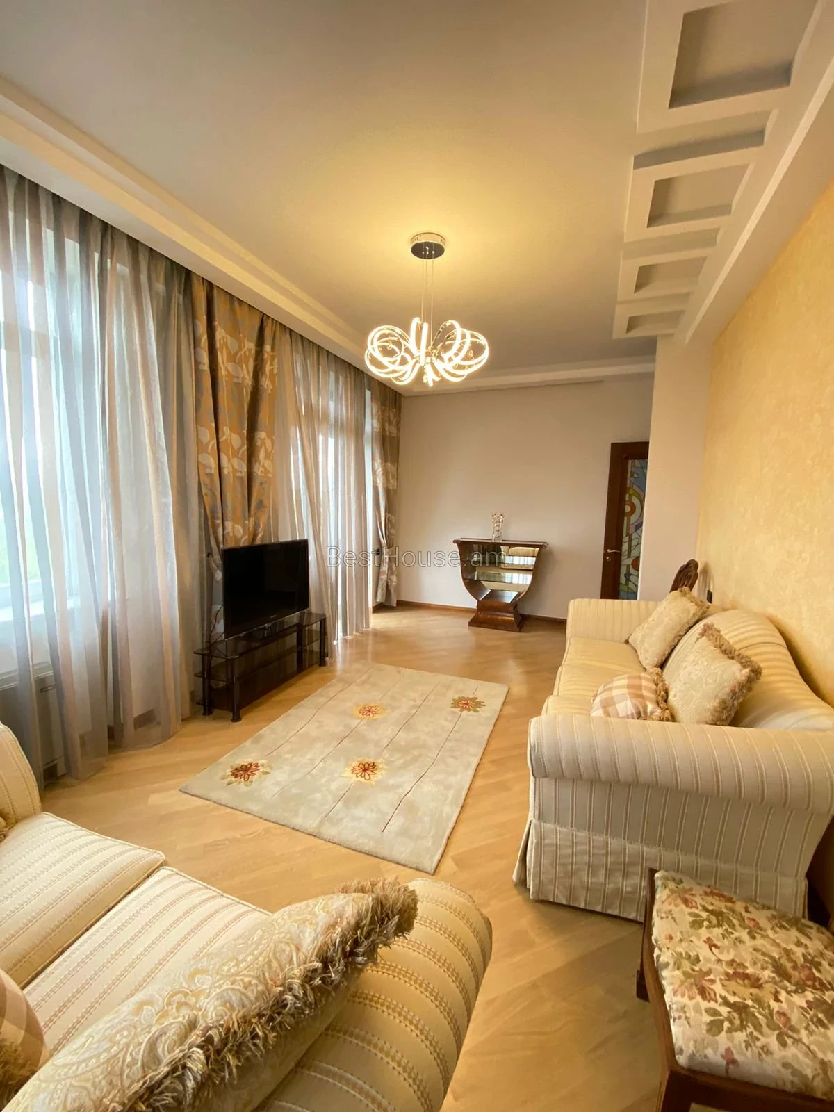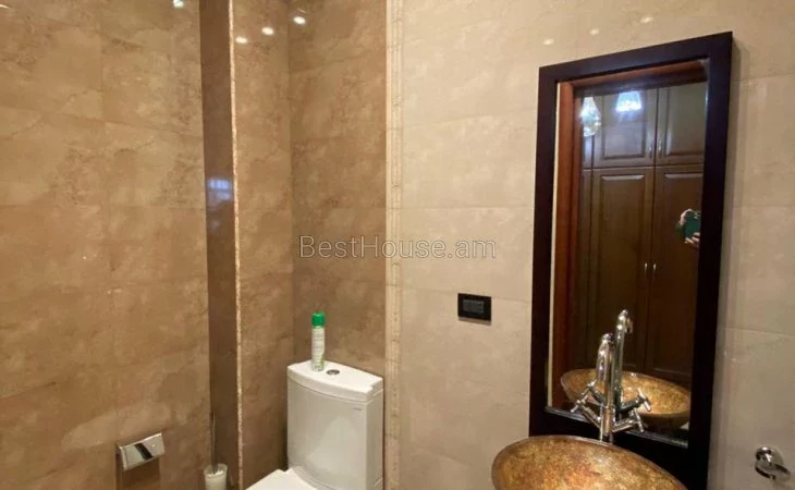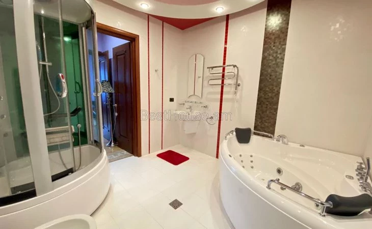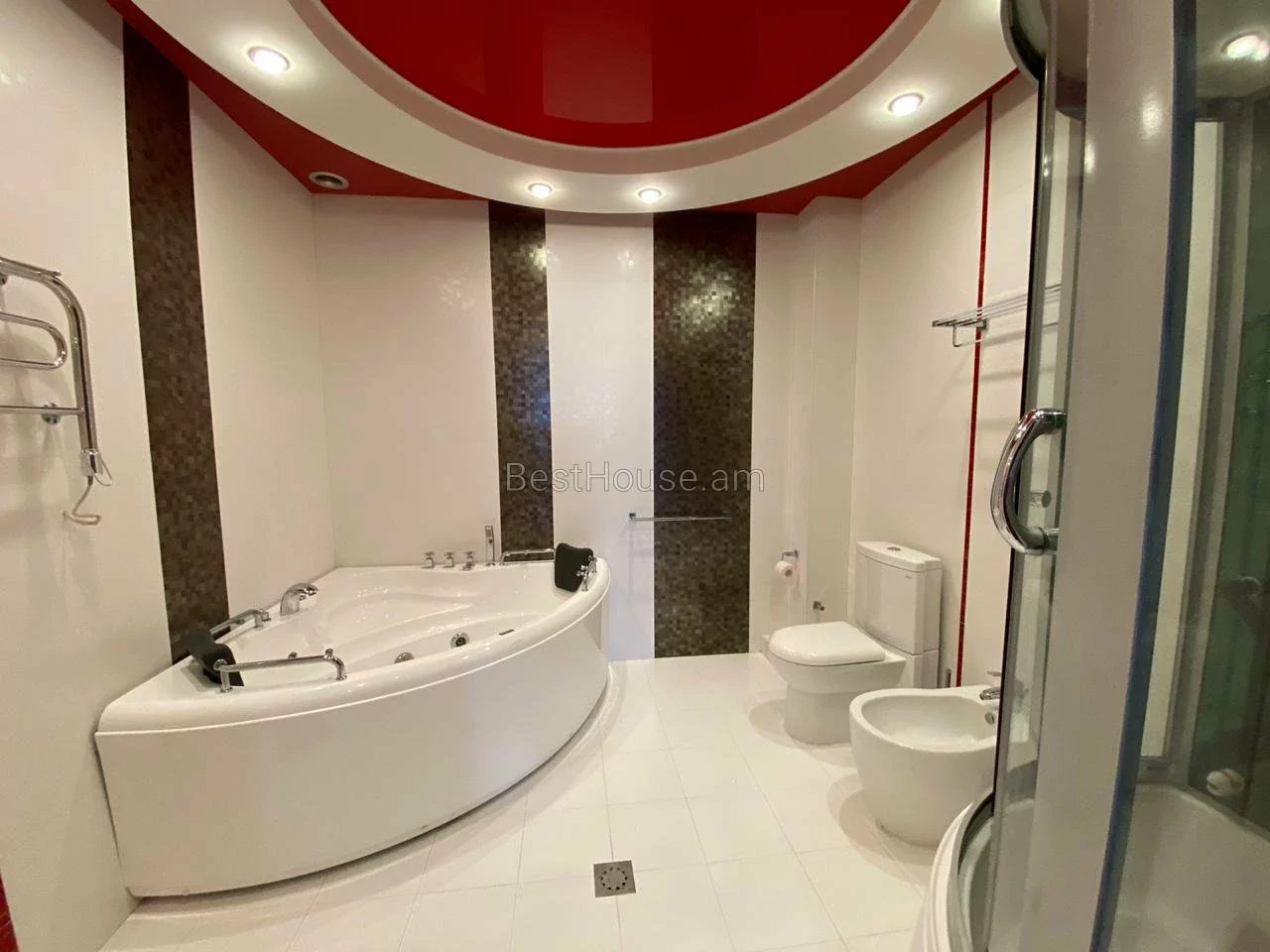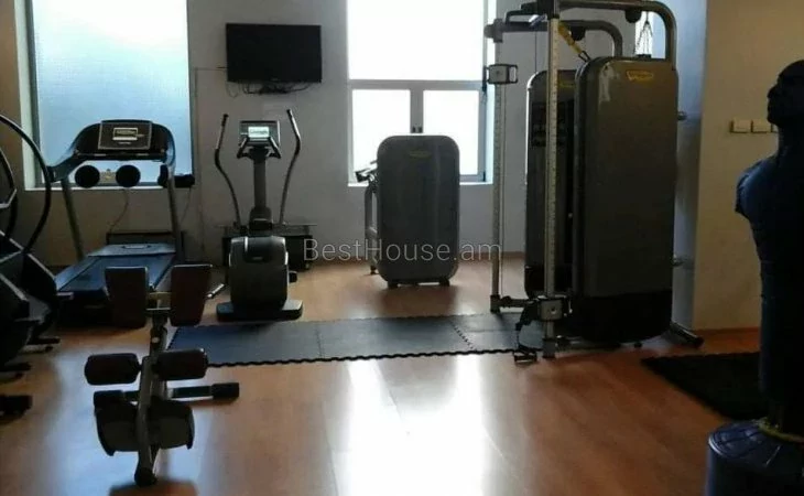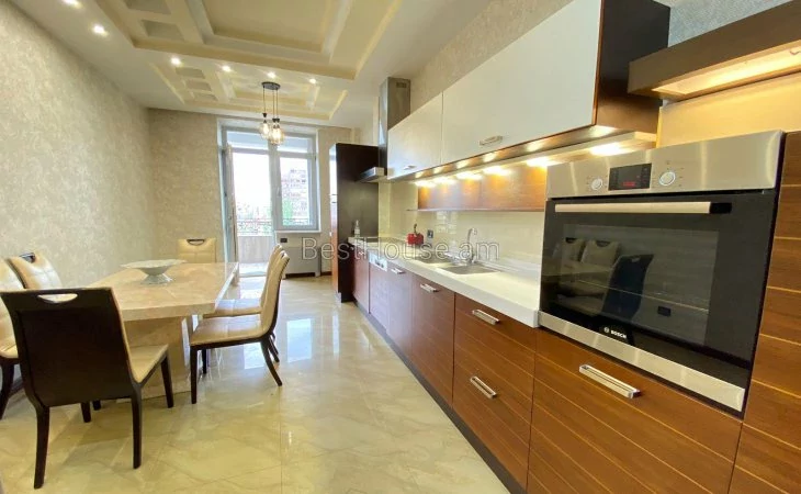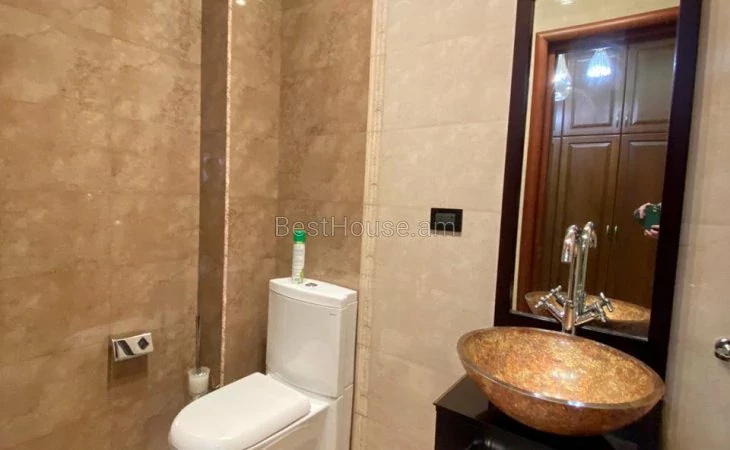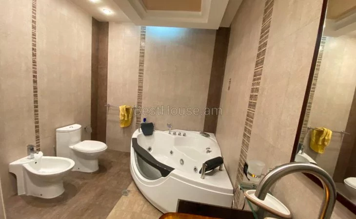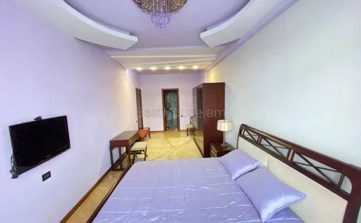 A 5-room apartment is for rent in the Center, in a newly built Elite building. The apartment is equipped with all utilities, furniture and appliances. The apartment has a beautiful view. The apartment has - 3 bedrooms, - 1 living room, - 1 rest room, - 1 separate kitchen, - 3 bathrooms. There is also a dishwasher and a microwave oven. There is a swimming pool and gym in the building. A garage for 2 cars is provided with the apartment.