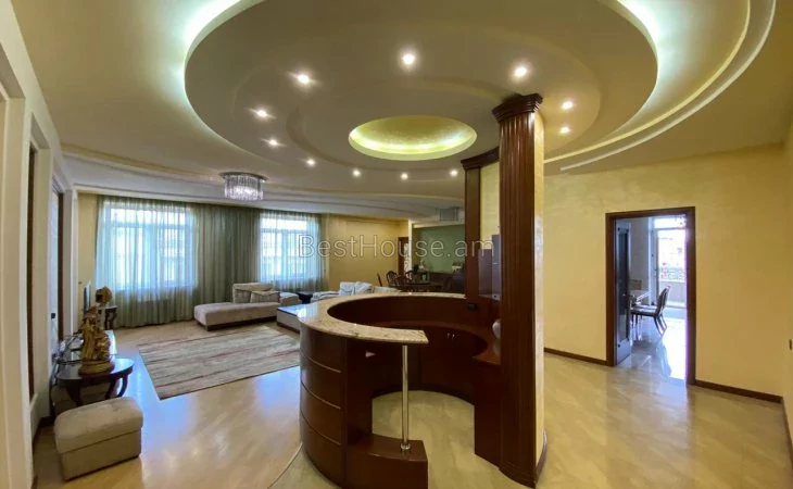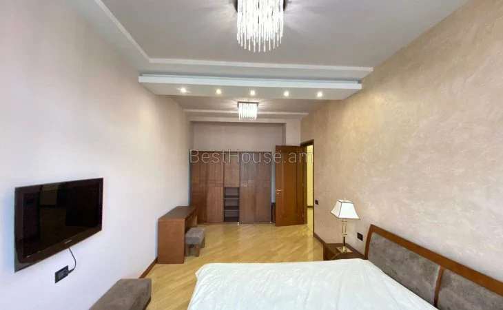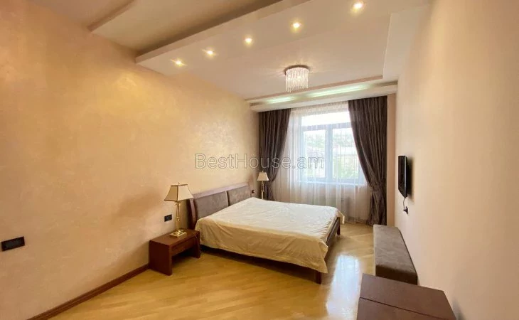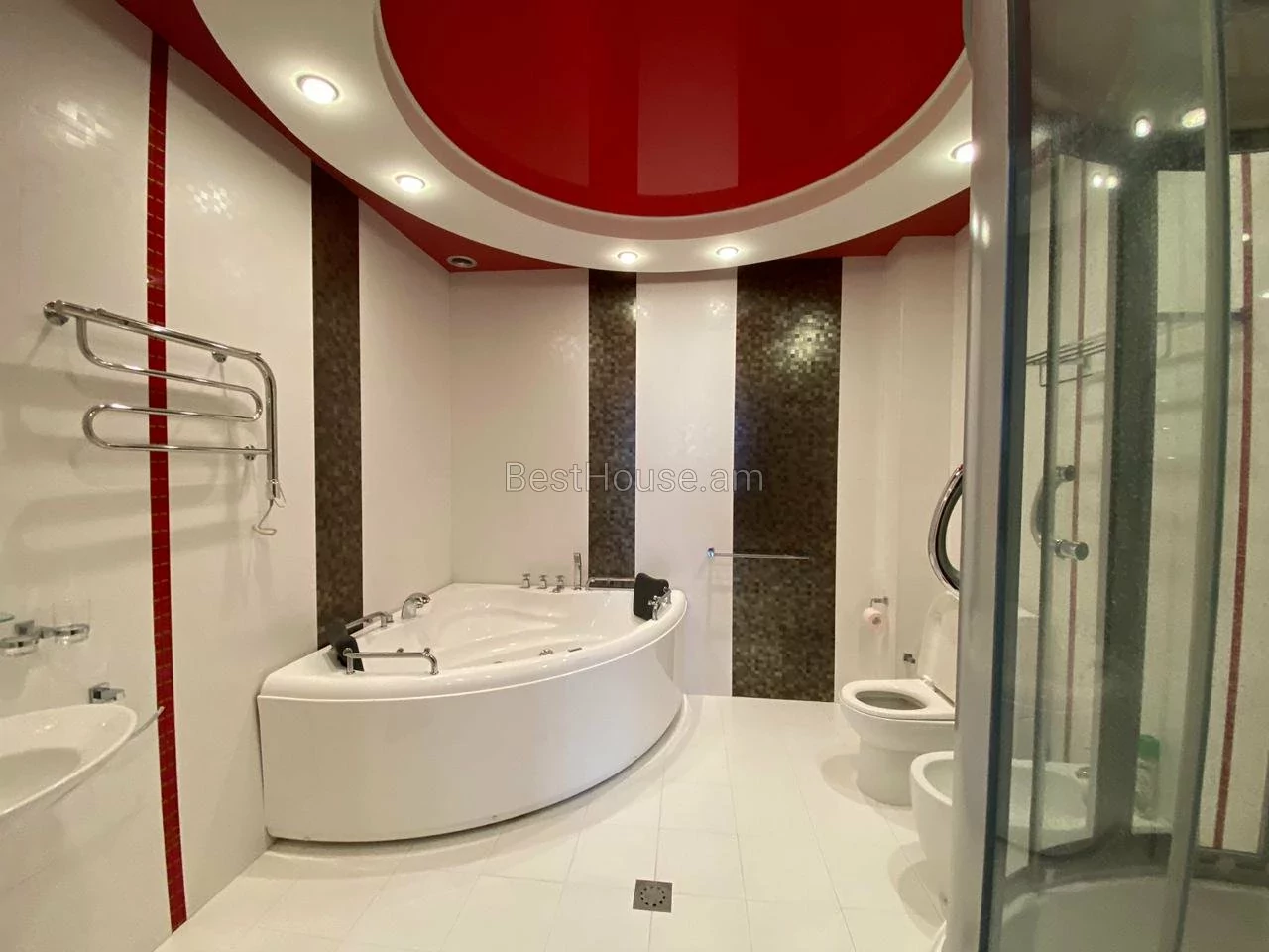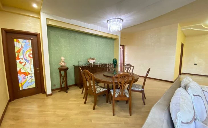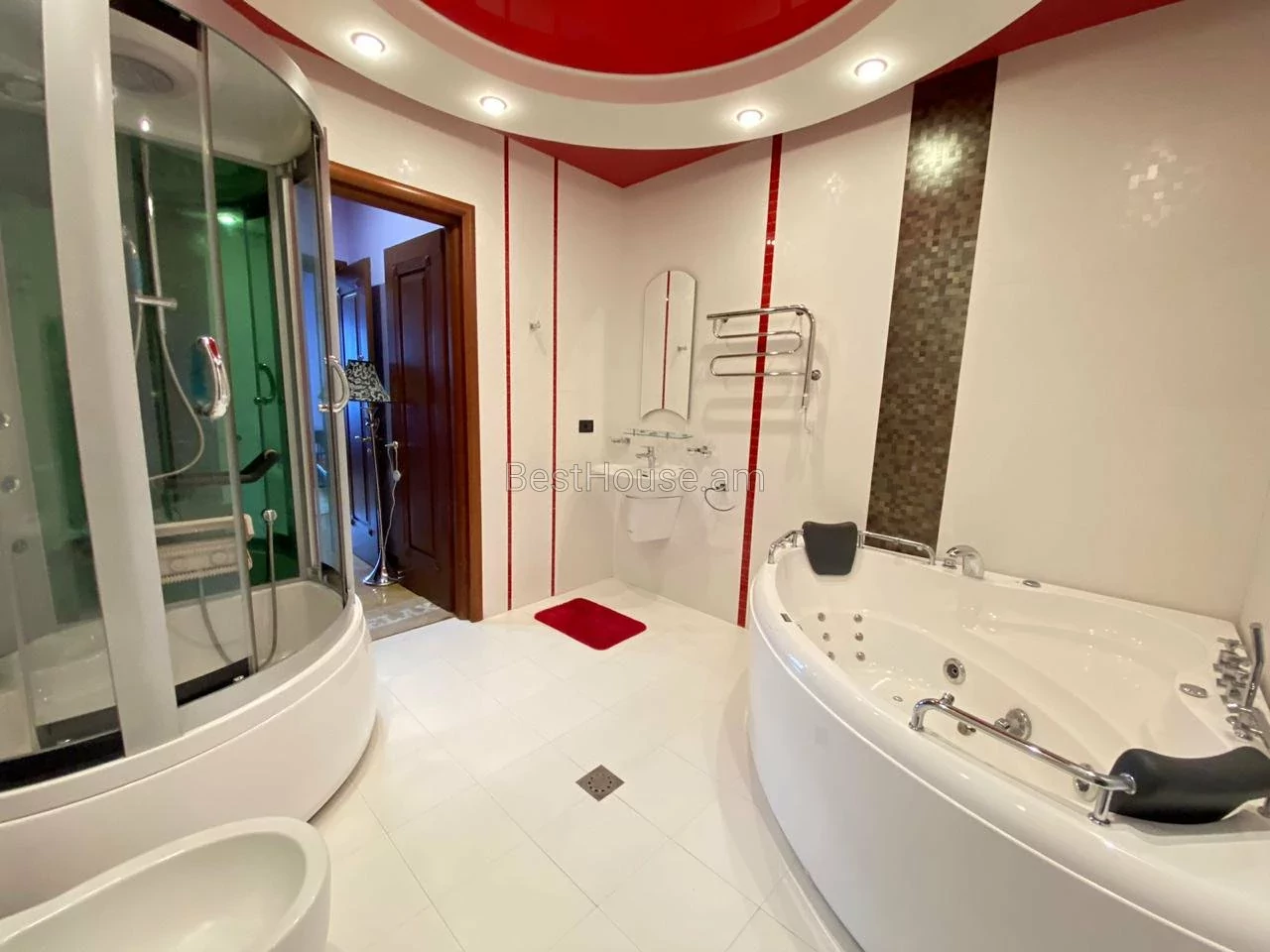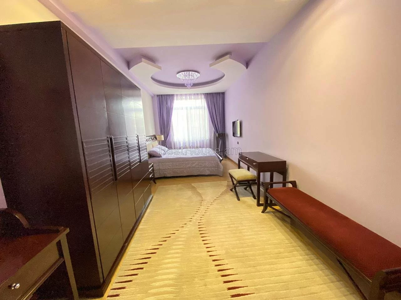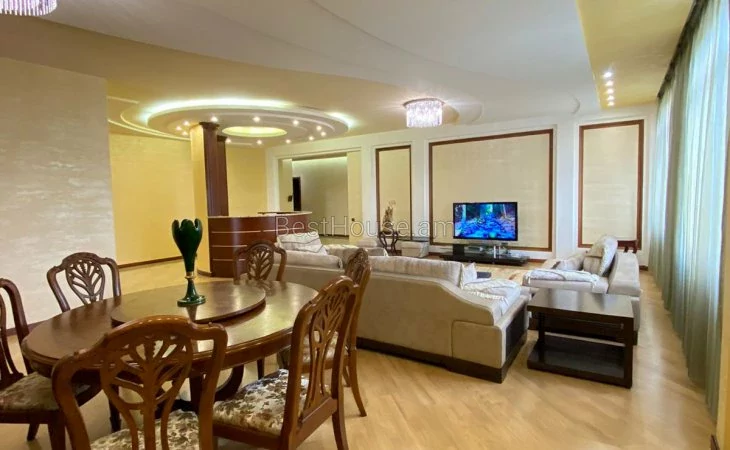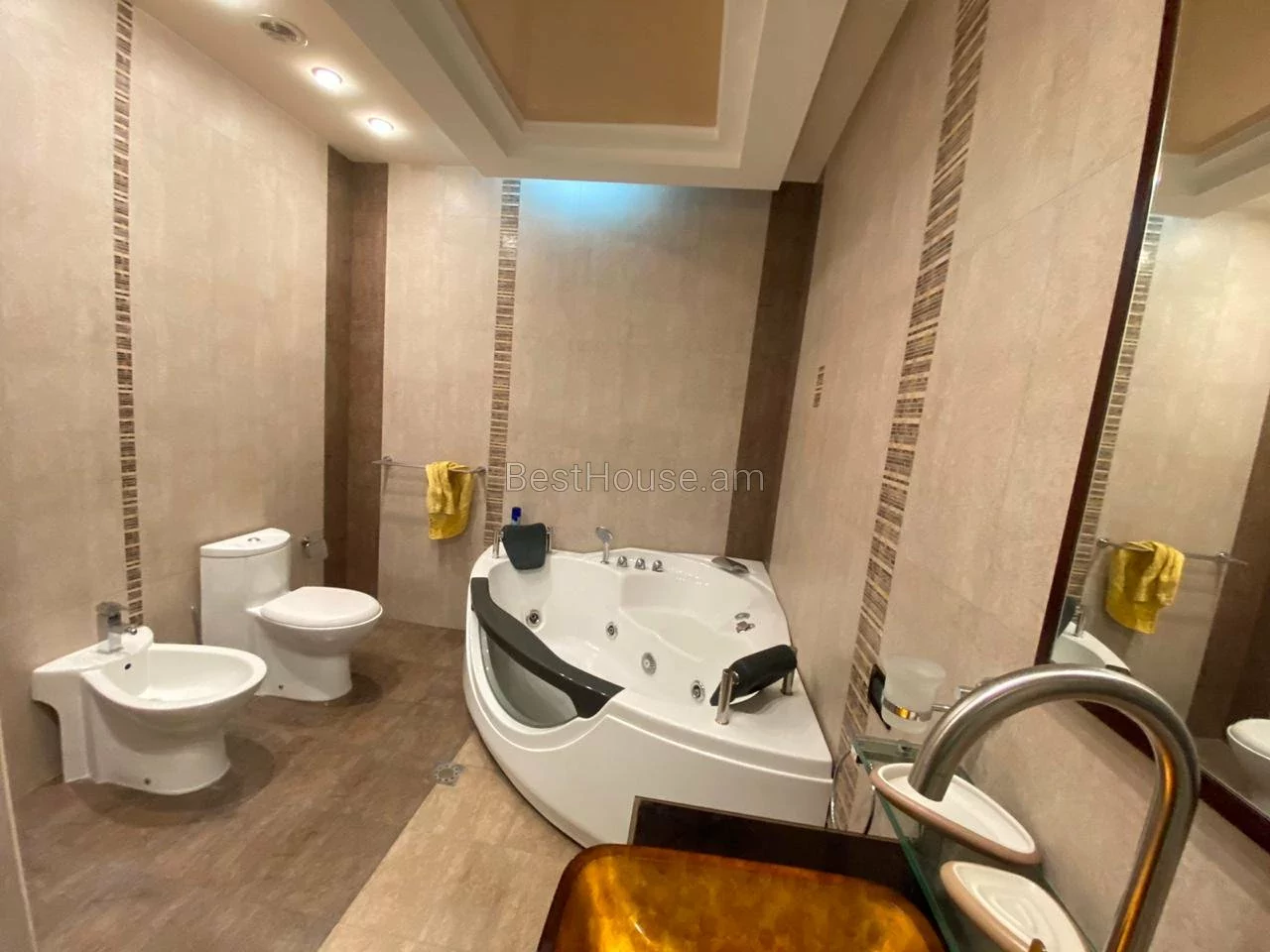 A 5-room apartment is for rent in the Center, in a newly built Elite building. The apartment is equipped with all utilities, furniture and appliances. The apartment has a beautiful view. The apartment has - 3 bedrooms, - 1 living room, - 1 rest room, - 1 separate kitchen, - 3 bathrooms. There is also a dishwasher and a microwave oven. There is a swimming pool and gym in the building. A garage for 2 cars is provided with the apartment.