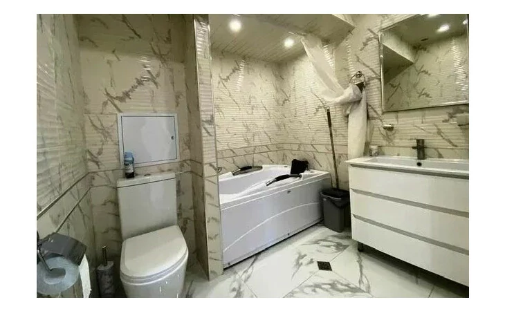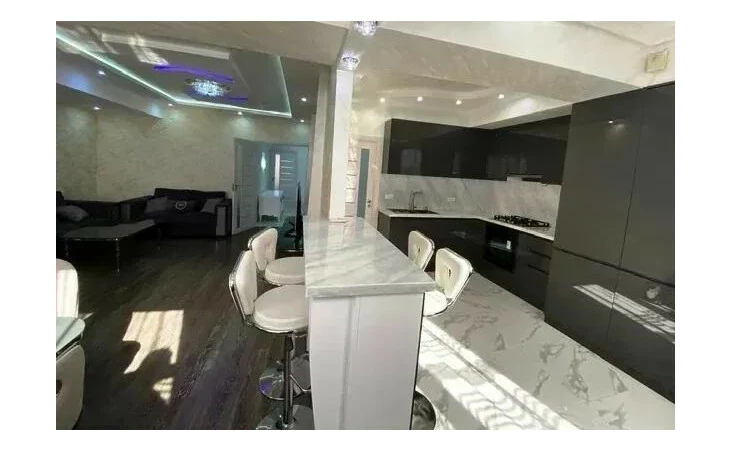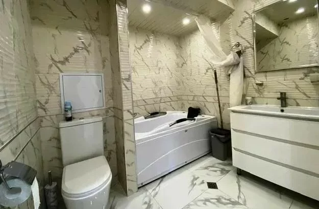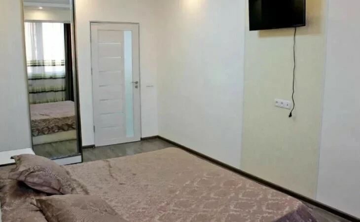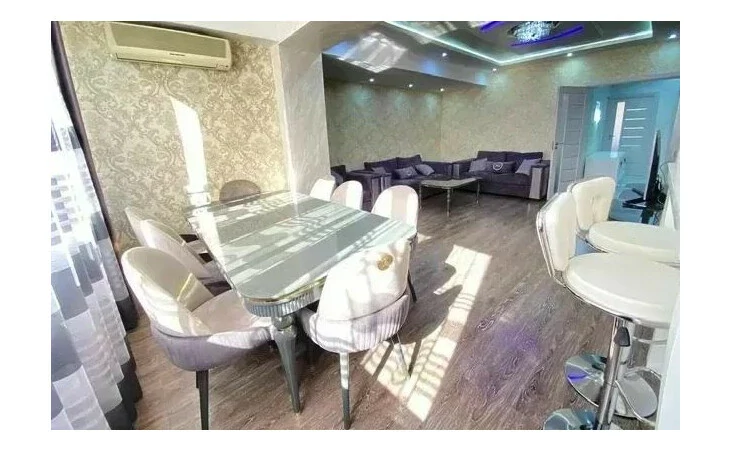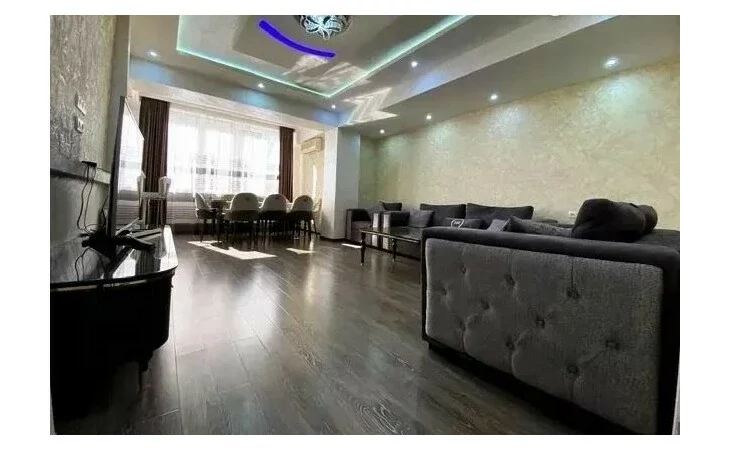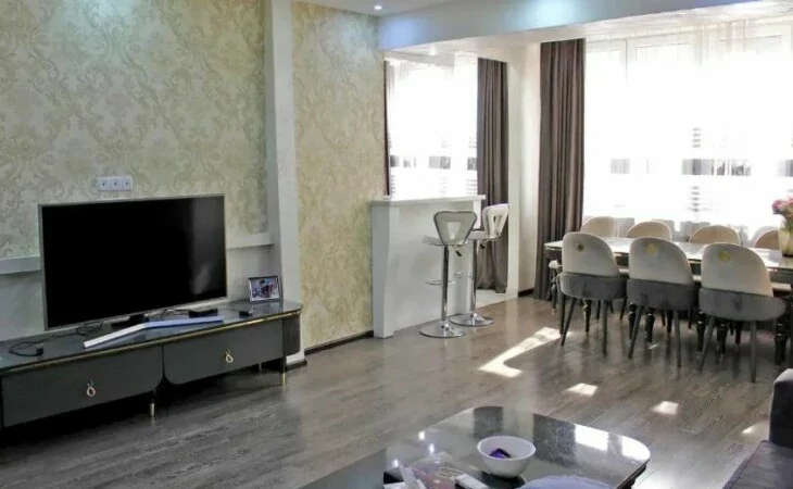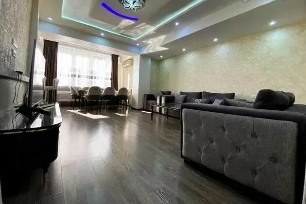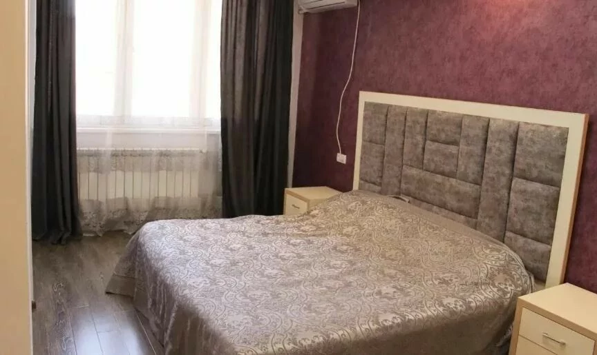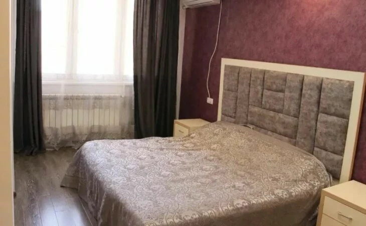 For rent is a 4-room apartment with an area of 106 sq. M., located on the 4th floor of a 9-story panel building. The apartment has been fully renovated. An iron door, euro windows, and air conditioning have been installed. It is heated by a heating system. It is provided with round-the-clock water and gas supply. The bathroom is tiled and equipped with plumbing. The apartment is equipped with furniture and appliances.