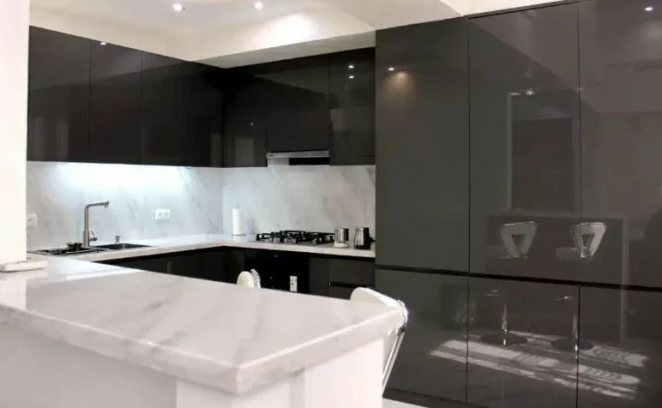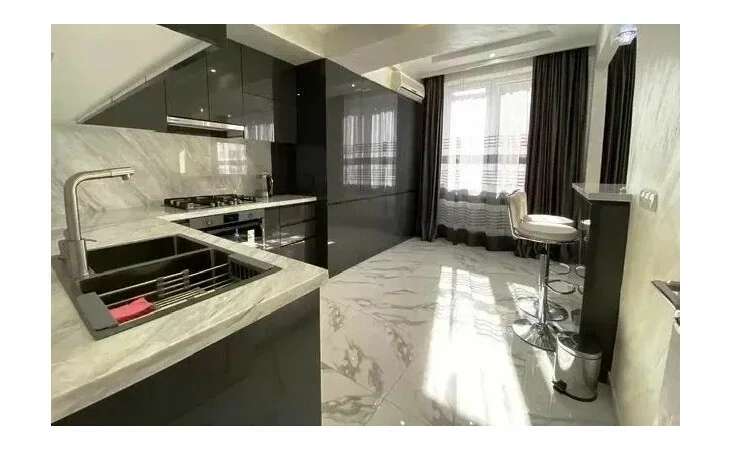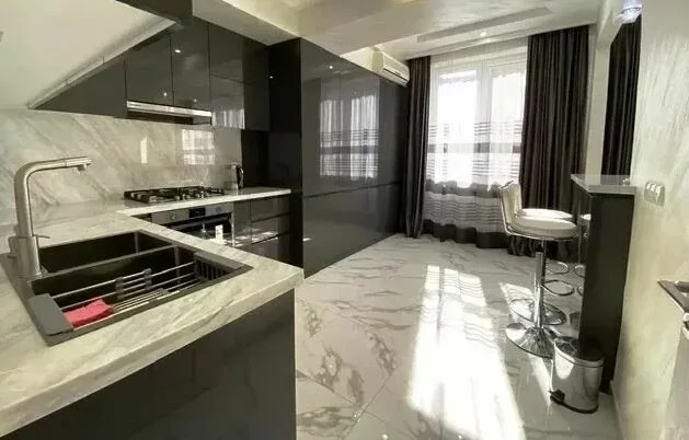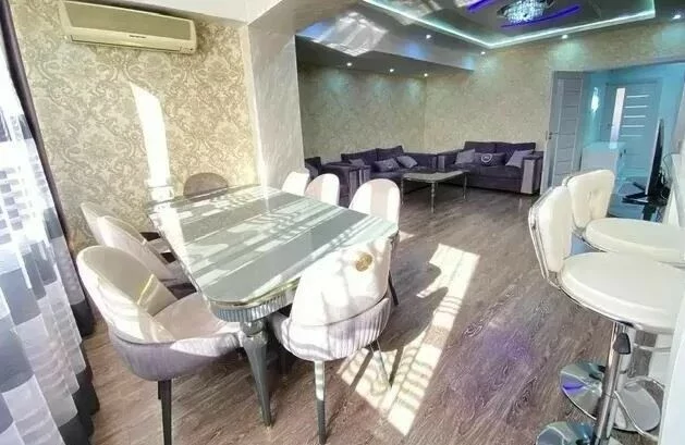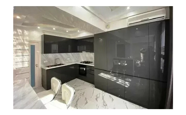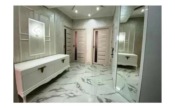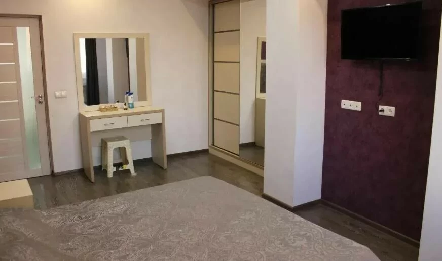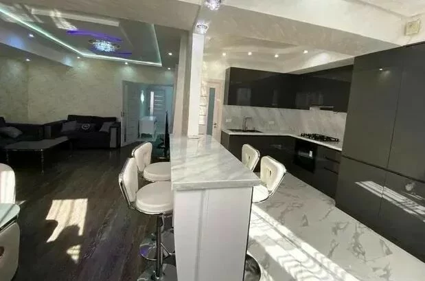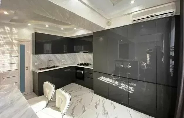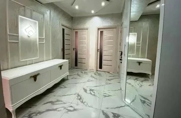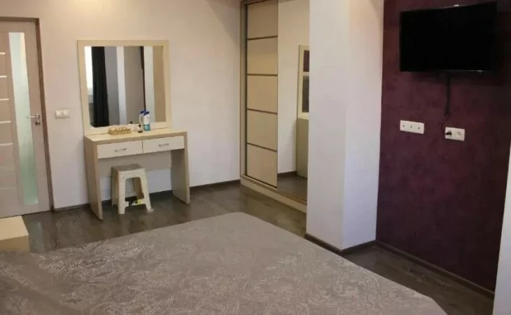 For rent is a 4-room apartment with an area of 106 sq. M., located on the 4th floor of a 9-story panel building. The apartment has been fully renovated. An iron door, euro windows, and air conditioning have been installed. It is heated by a heating system. It is provided with round-the-clock water and gas supply. The bathroom is tiled and equipped with plumbing. The apartment is equipped with furniture and appliances.
