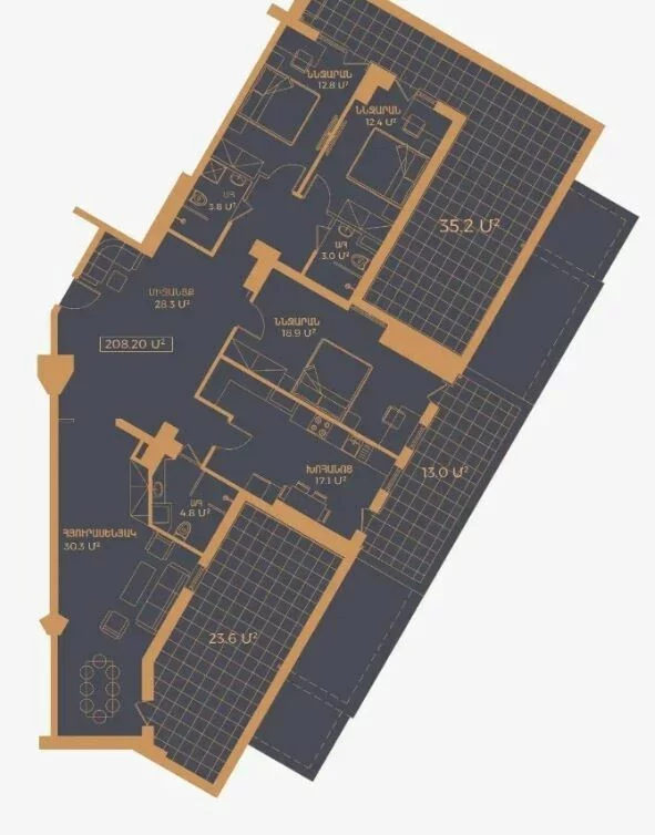 4 սենյականոց Պենտհաուս Անտառայինում,բնակարանը գտնվում է զրոյական վիճակում,Ցանկության դեպքում հնարավորություն կա տարբեր ձևի փոխել դիրքերը հատակագծի ըստ հարմարավետության և ճաշակի`իհարկե Ճարտարապետի կողմից հաստատված: