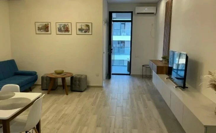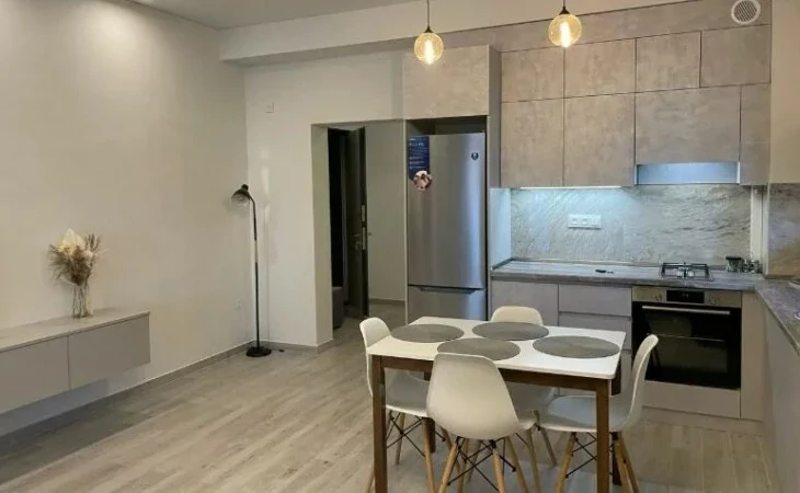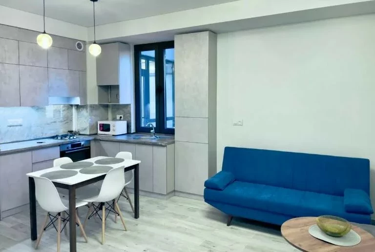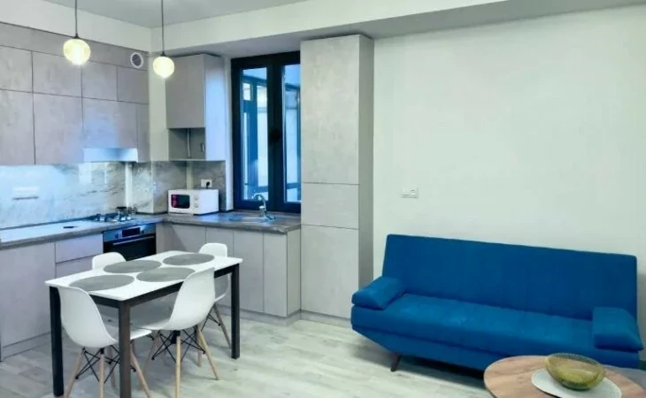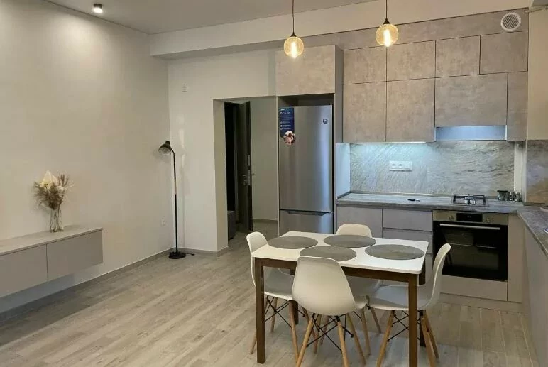 Большая гостиная, совмещенная с современной кухней.