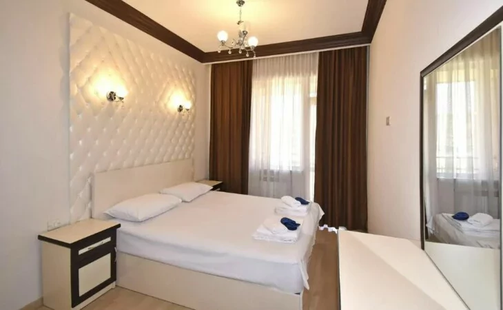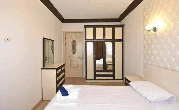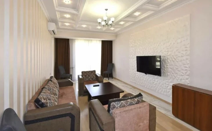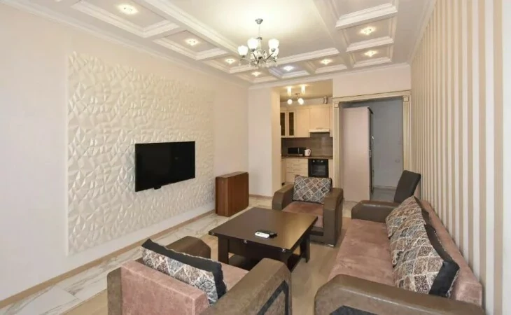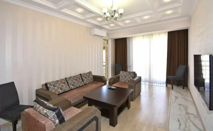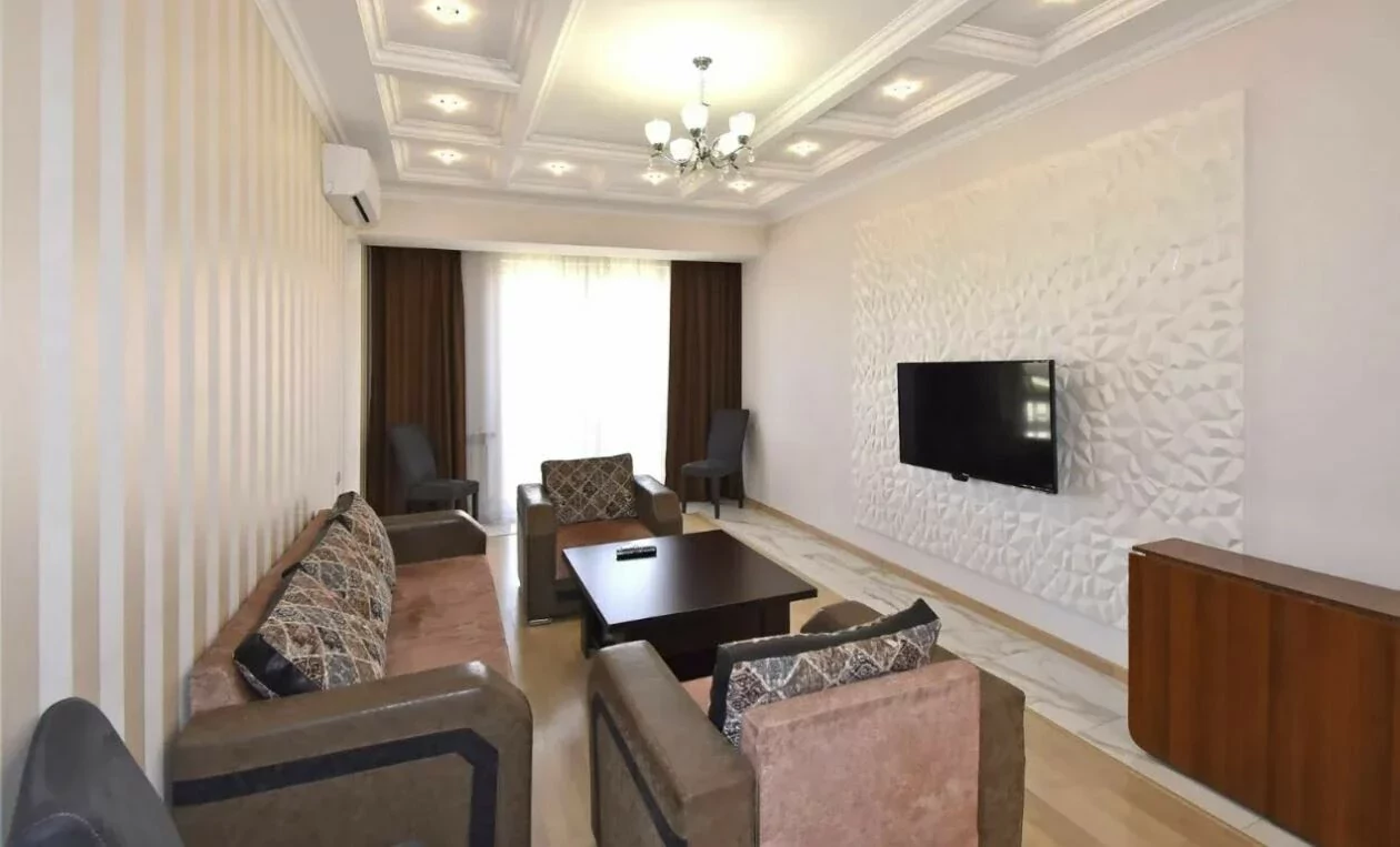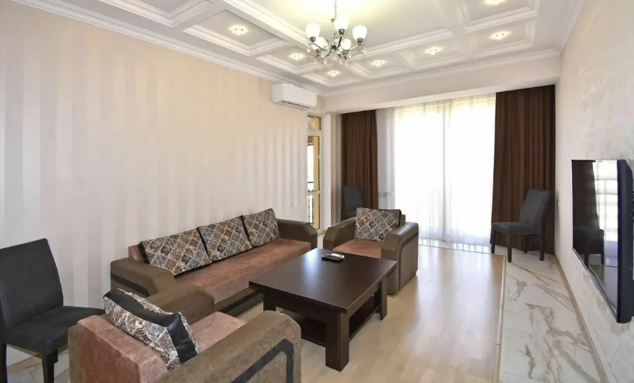 Сдается 2-комнатная квартира в новостройке по улице Павстоса Бузанди, 65 квадратных метров, квартира укомплектована необходимым имуществом и бытовой техникой.