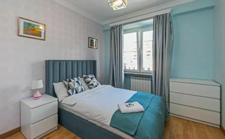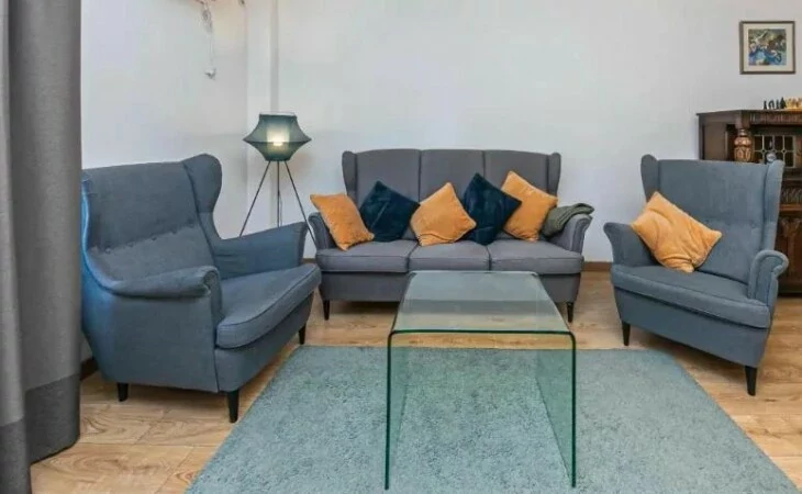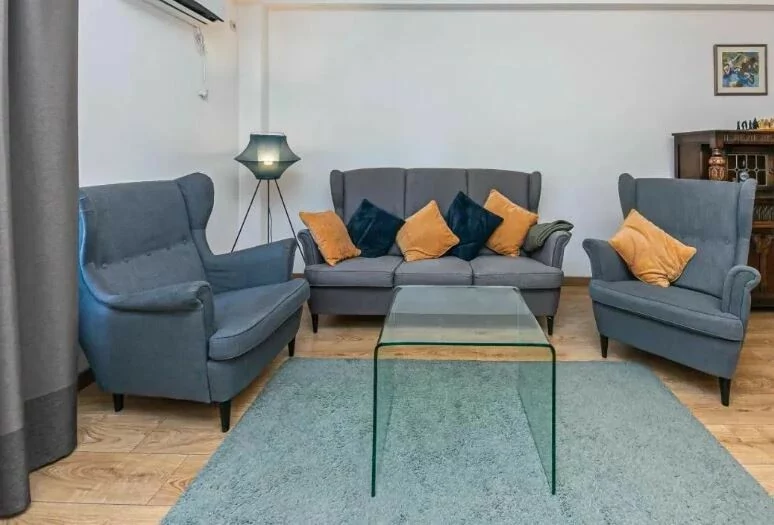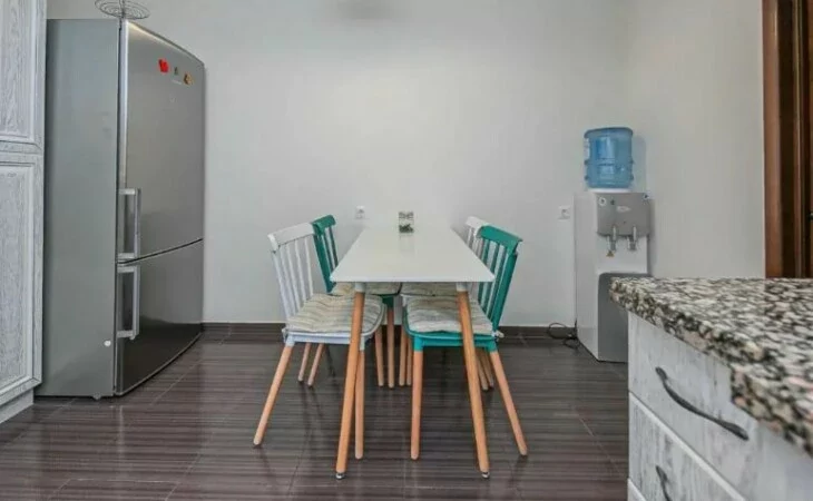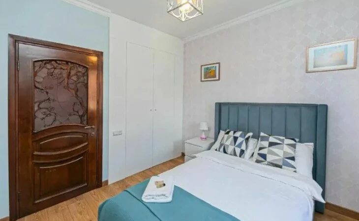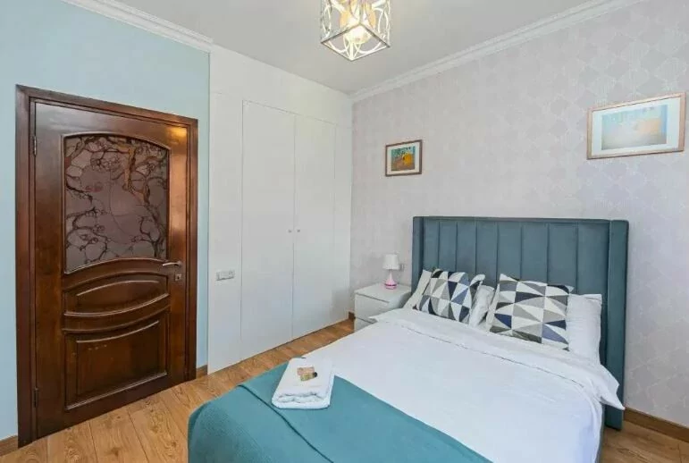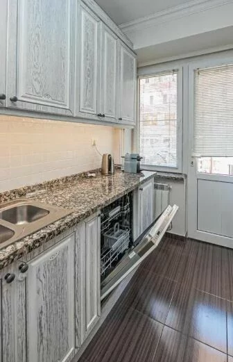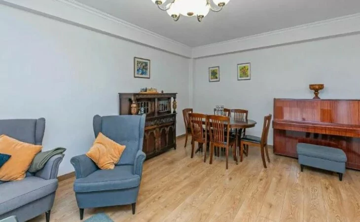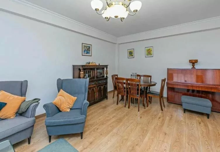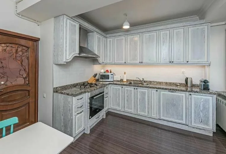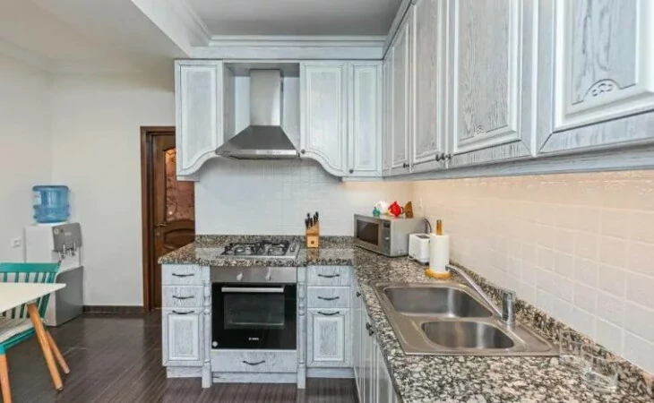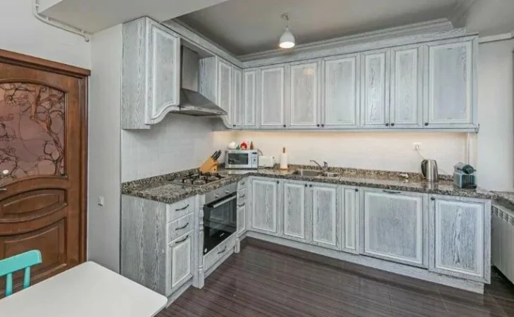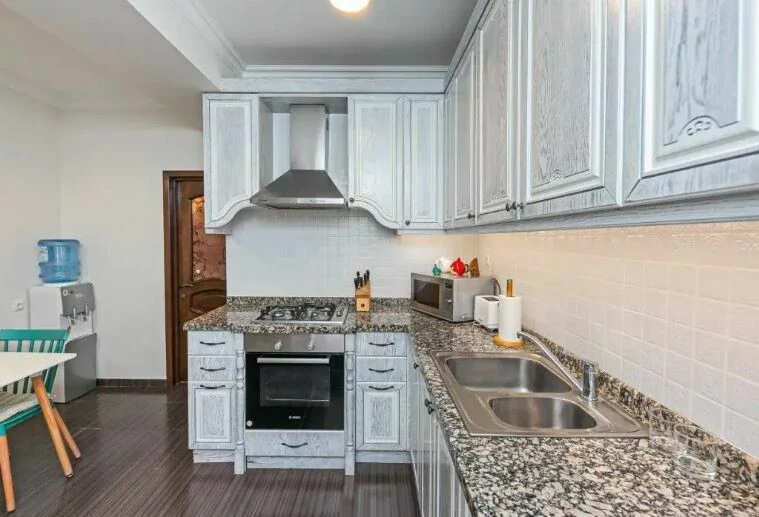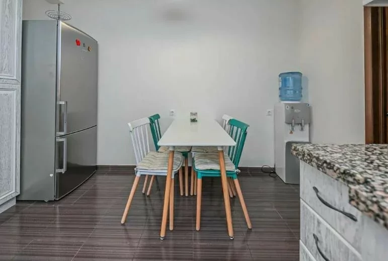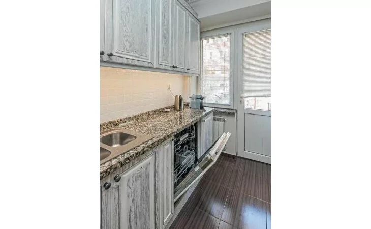 В квартире просторная гостиная, отдельная кухня, оснащенная всей необходимой техникой и посудой.