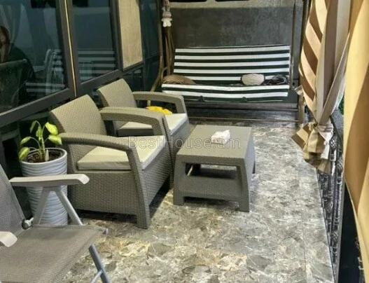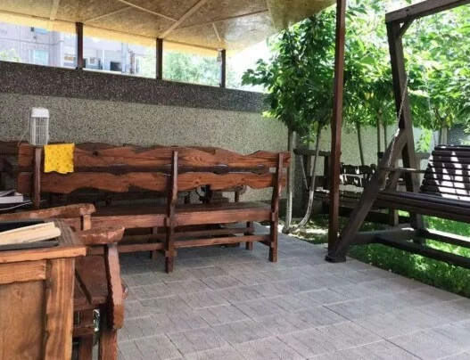 На каждом этаже имеется по балкону, есть дворик (100 кв. М.) для отдыха и шашлыков, с уютной беседкой (стол 2.4x1м, скамейки, стулья), мангалом, качелями и гамаком.