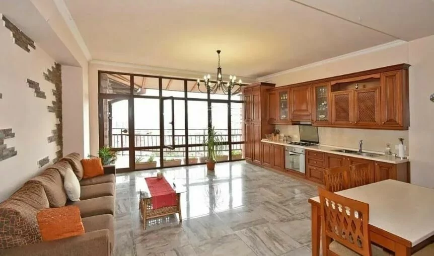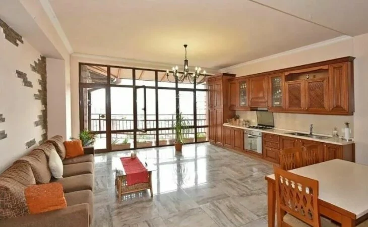 Здание построено из туфа. В здании установлен лифт KONE. Квартира расположена на верхнем этаже здания, это пентхаус. Она солнечная и хорошо отремонтирована.
