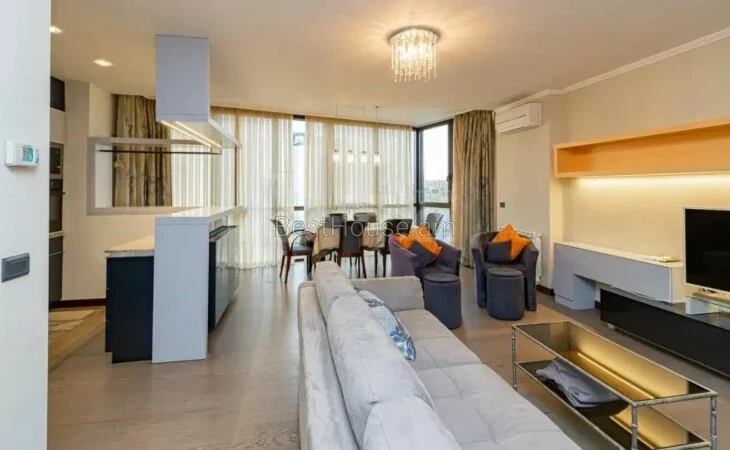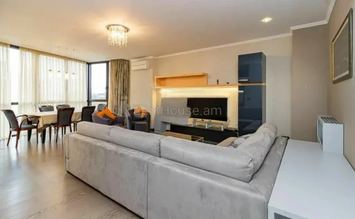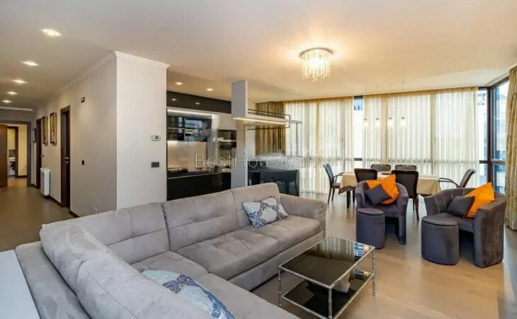 Сдается красивая 3-комнатная квартира в новостройке на улице Вазгена Саргсяна, 120 квадратных метров, недалеко от площади Республики, квартира укомплектована необходимым имуществом и бытовой техникой.