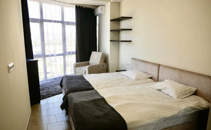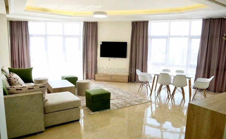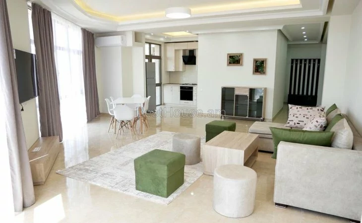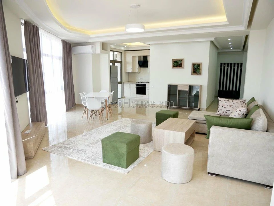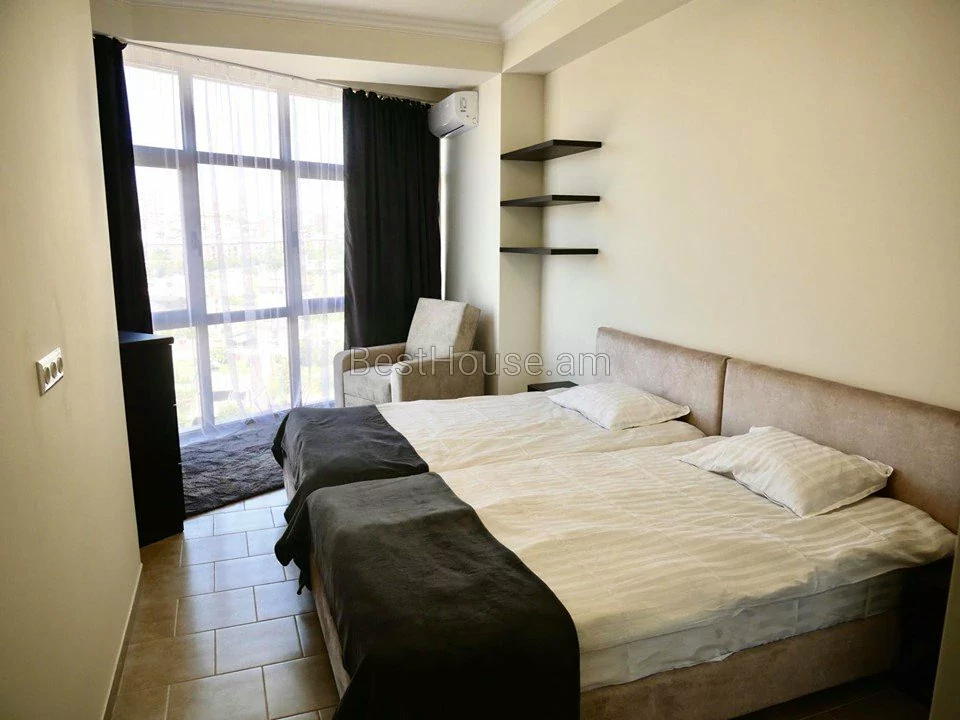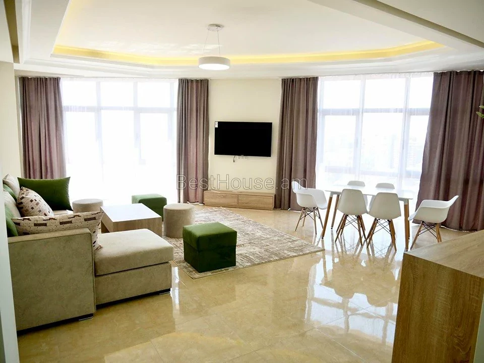 Cдается в аренду 3 комнатная квартира площадью 108 кв.м. на 13 этаже 15 этажной новостройки на улице Верин Антараин. Выполнен капитальный ремонт. Окна - пластиковые, со стеклопакетами. Проведена локальная система отопления. Установлен кондиционер. Санузла отделаны кафельной плиткой и оснащены сантехникой. Кухня меблирована. Есть открытый балкон с видом на гору Арарат. Доступны кабельное телевидение и интернет. Установлена система безопасности. Есть парковка.