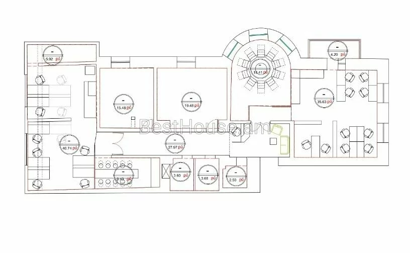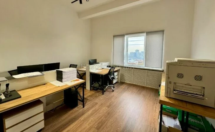 Имеет общие большие, средние и малые офисы/конференц-зал/две отдельные комнаты/кухню/открытый балкон/две кладовые/два санузла.