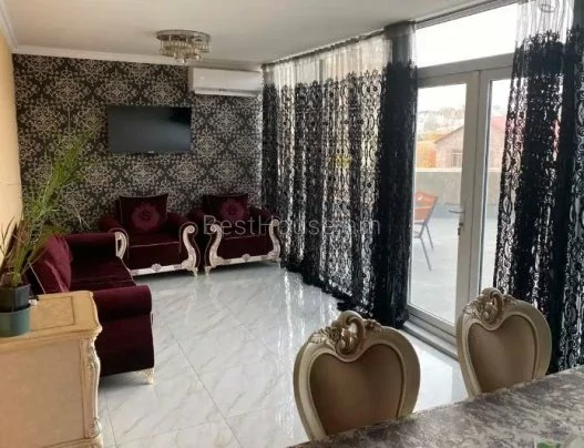 Продается 2-комнатная квартира с дизайнерским ремонтом, 1-й блок, площадью 57 квадратных метров. Имеется открытая крытая парковка и открытая терраса. Оборудована бытовой техникой и частично мебелью.